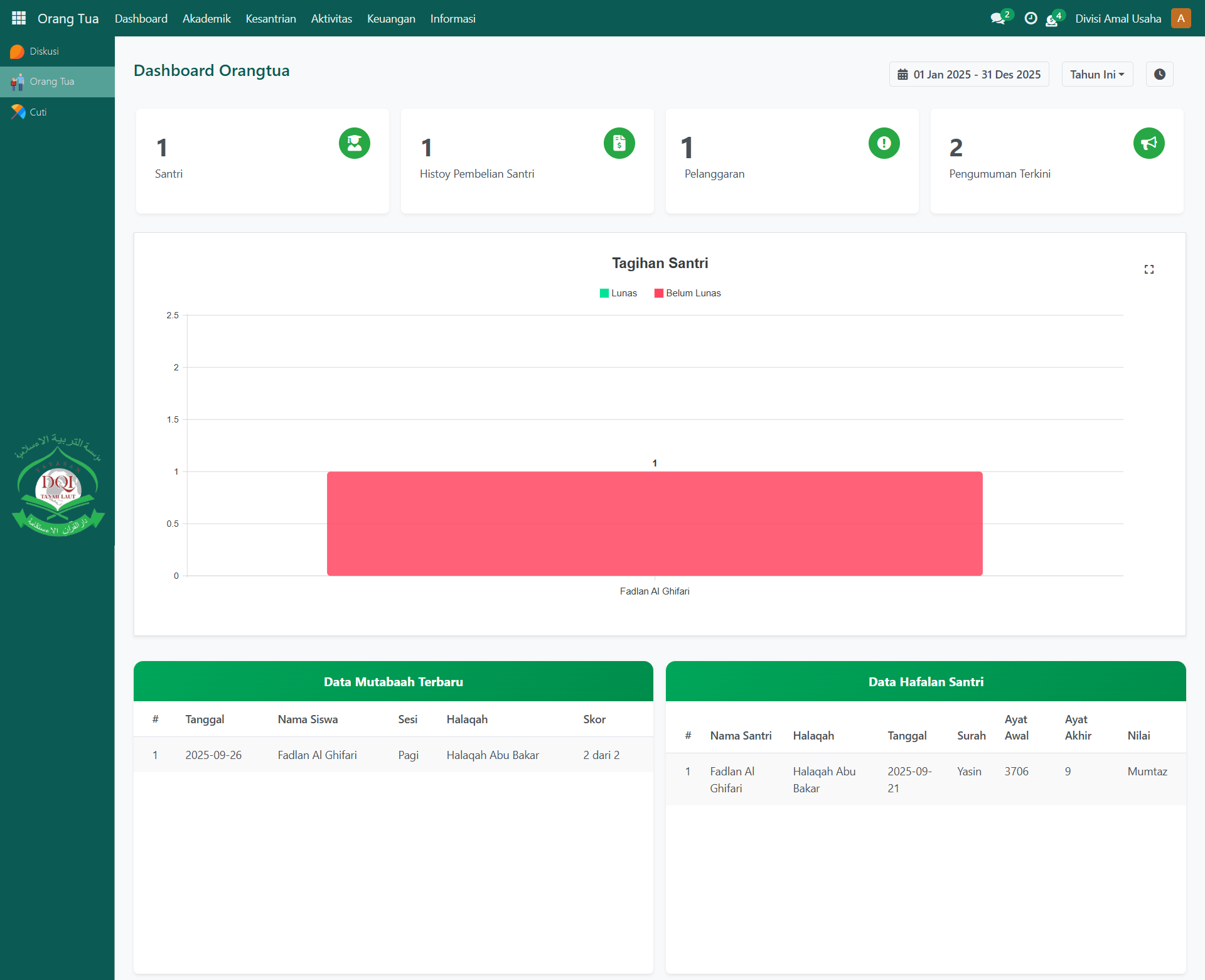 | Santri | Menunjukkan jumlah anak (santri) yang terhubung dengan akun orang tua. |