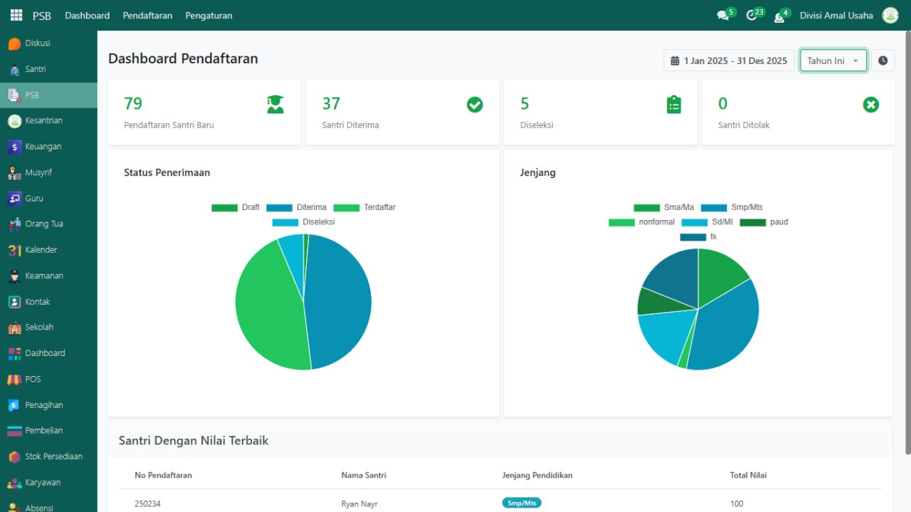 | Pendaftaran Santri Baru | Menampilkan total seluruh pendaftar santri baru di sistem PSB. |