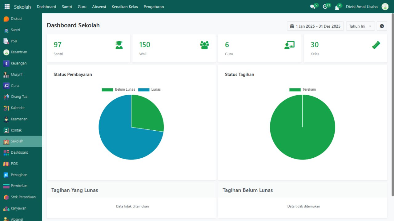 Halaman Dashboard Sekolah merupakan tampilan utama yang pertama kali terlihat setelah admin atau staf sekolah berhasil login ke sistem. Di halaman ini, disajikan ringkasan informasi penting mengenai aktivitas sekolah secara real-time, termasuk data santri, wali, guru, kelas, serta status pembayaran dan tagihan.