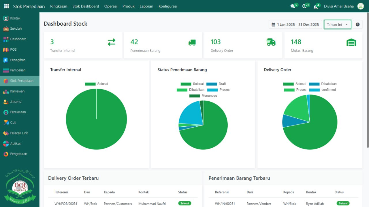 Halaman Dashboard Stok Persediaan merupakan tampilan utama yang pertama kali terlihat setelah staf gudang atau administrator berhasil login ke sistem. Di halaman ini, disajikan ringkasan informasi penting mengenai manajemen persediaan barang secara real-time, termasuk transfer internal, penerimaan barang, dan status delivery order.