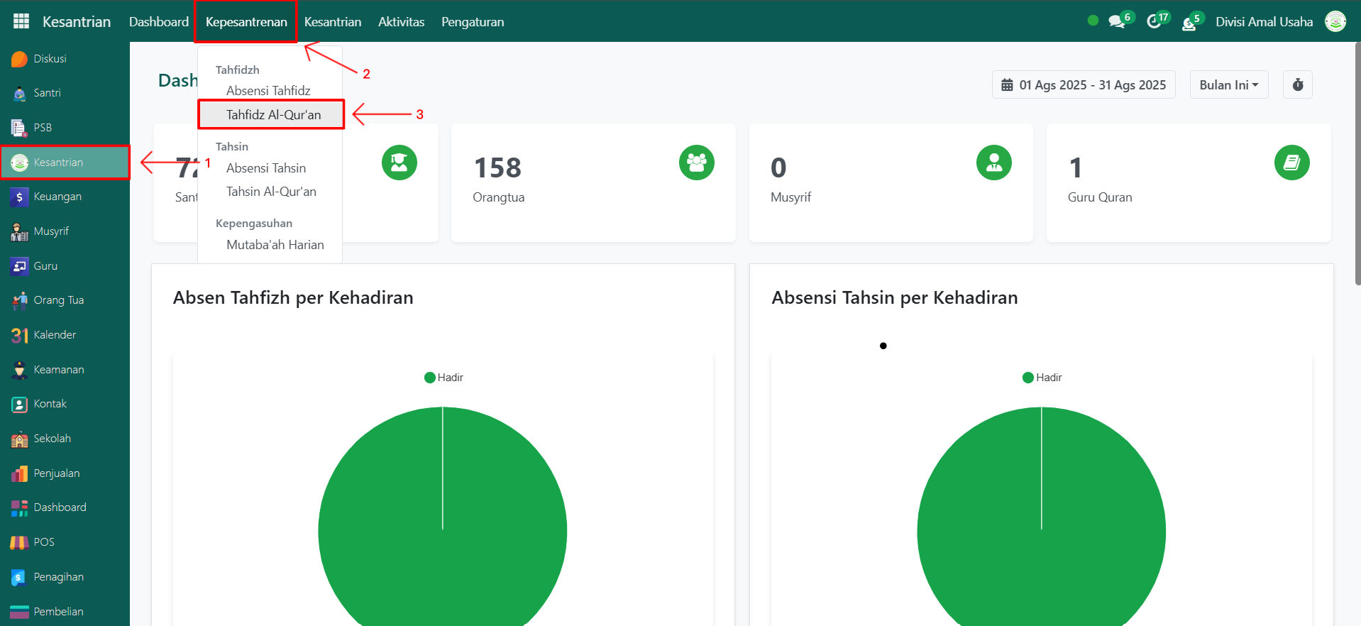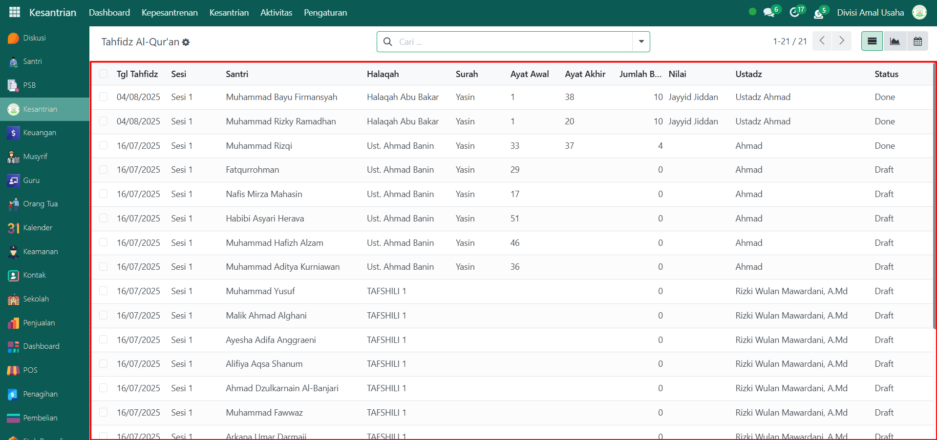 Dengan langkah-langkah ini, Anda dapat memonitor perkembangan hafalan Al-Qur’an santri secara detail dan terstruktur.