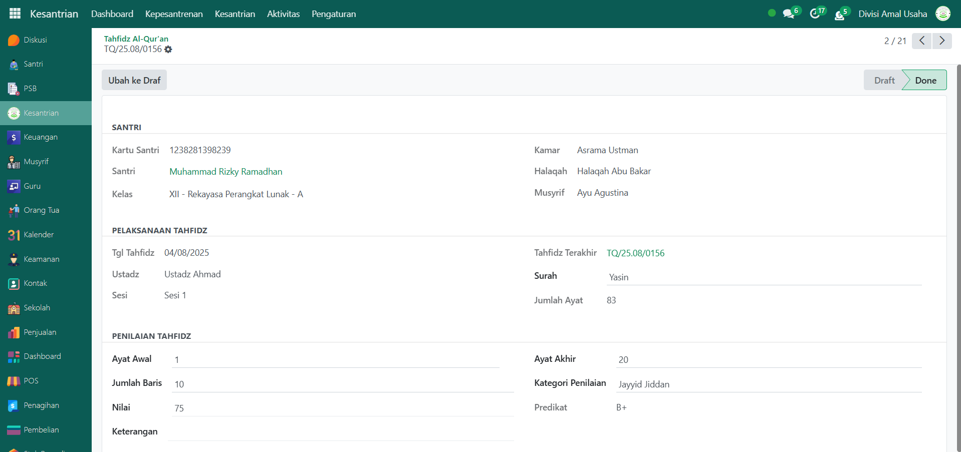 Berikut adalah langkah-langkah untuk melihat riwayat tahfidz al-qur'an pada Odoo Pesantren.