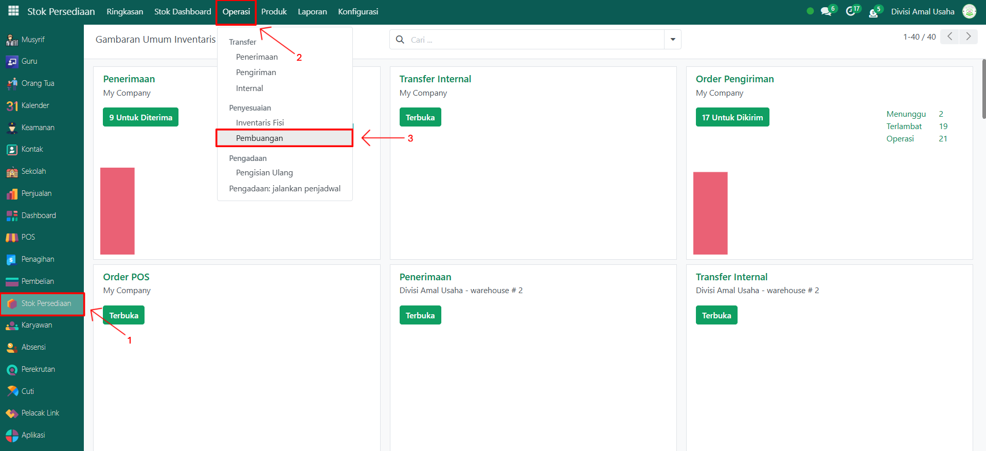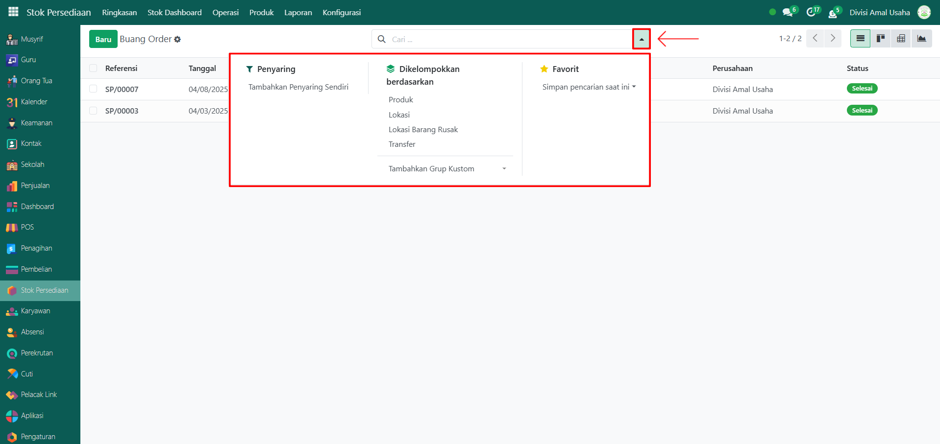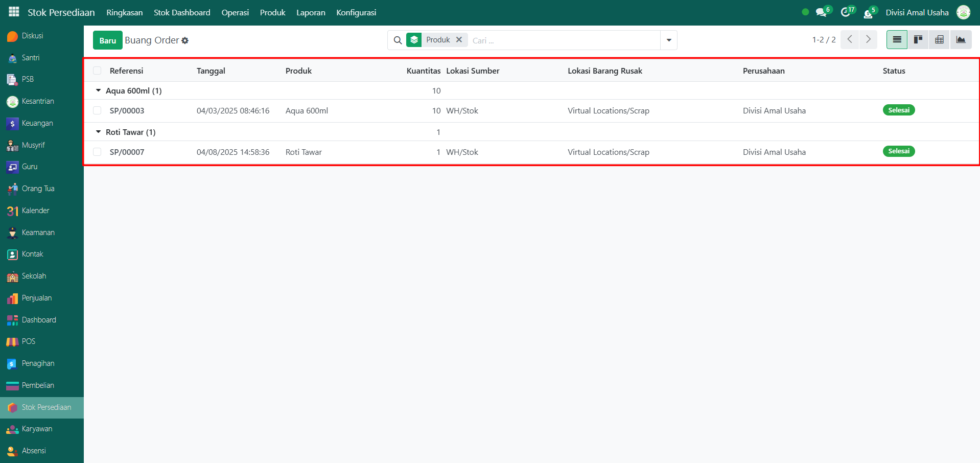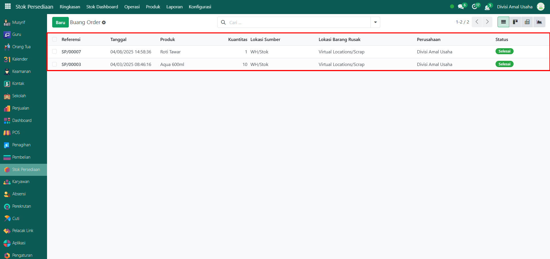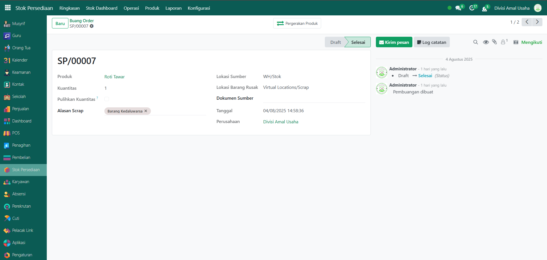 Berikut adalah langkah-langkah untuk melihat data riwayat pembuangan barang pada Odoo Pesantren.