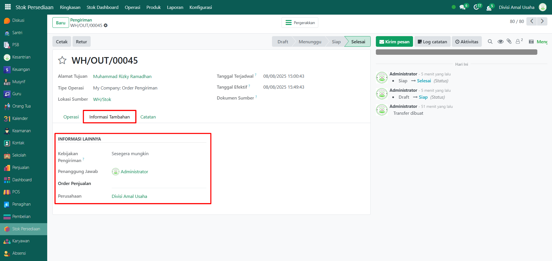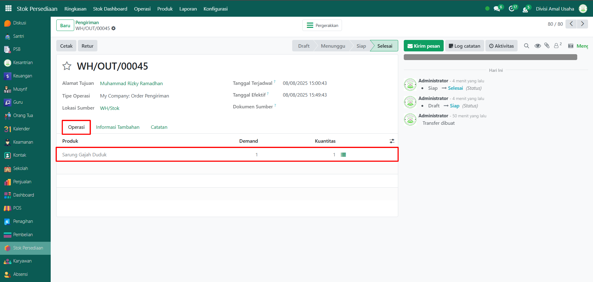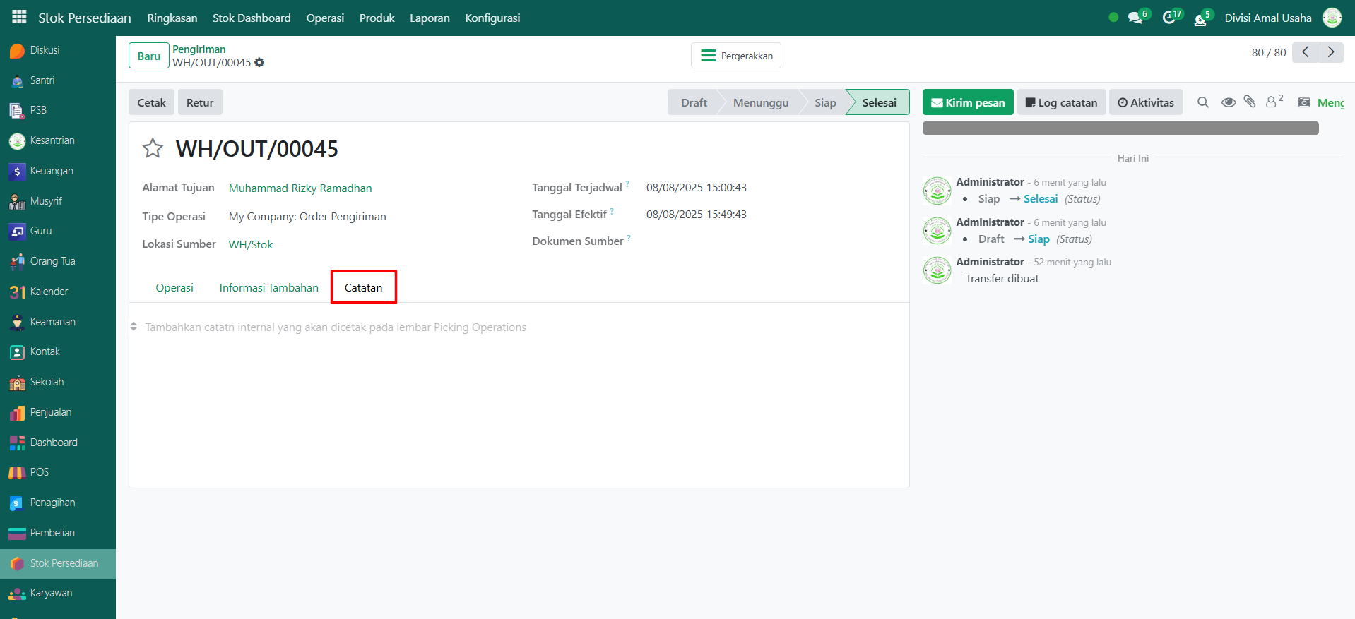 Berikut adalah langkah-langkah untuk melihat data riwayat pengiriman barang pada Odoo Pesantren.