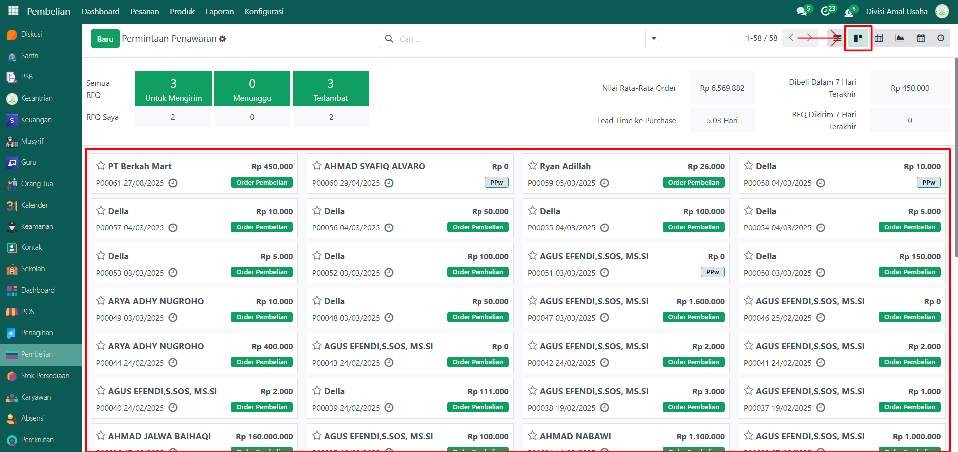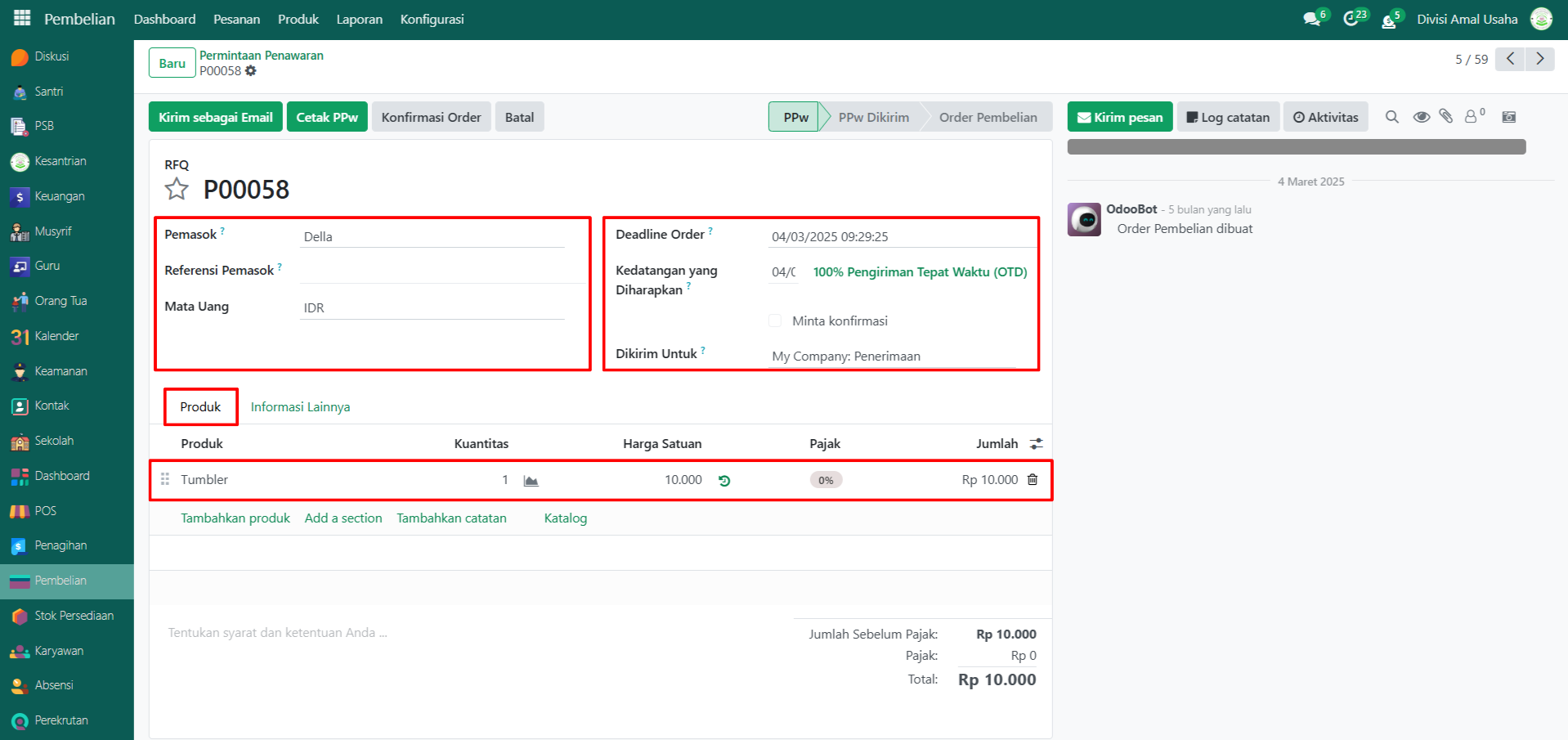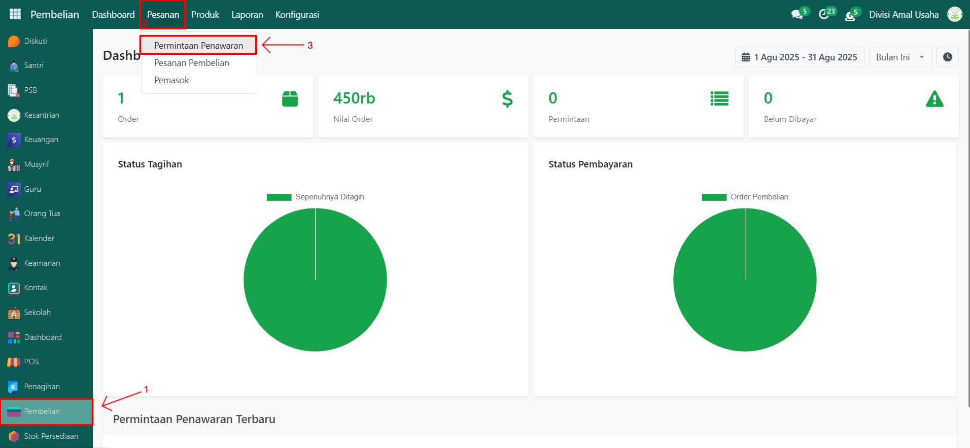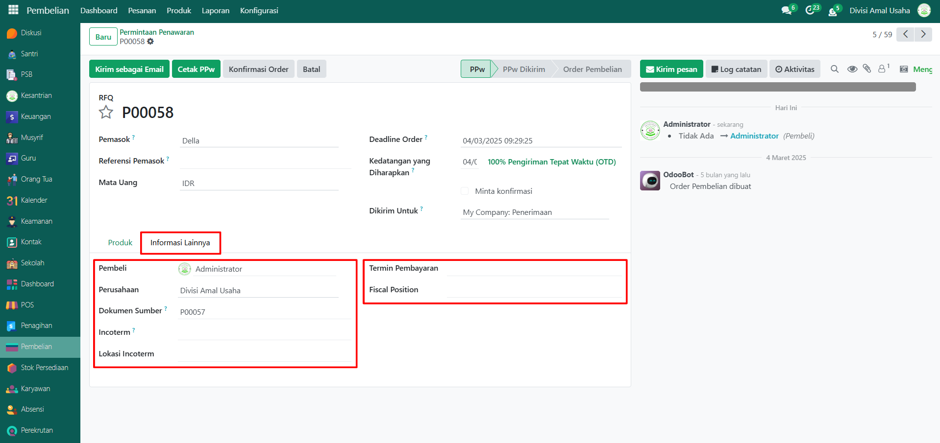 Berikut adalah langkah-langkah untuk melihat data riwayat permintaan penawaran pada Odoo Pesantren.