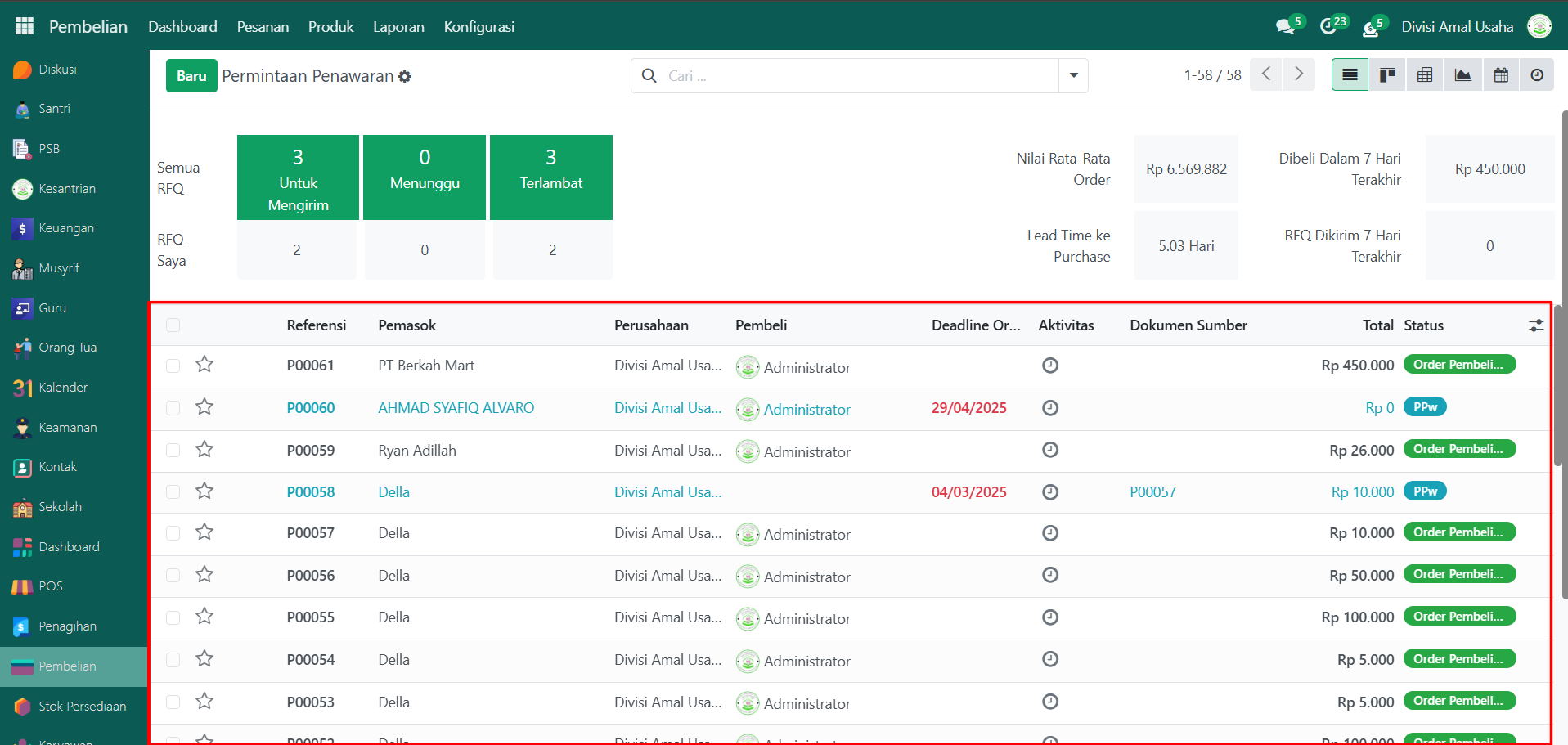 Data Riwayat Permintaan Penawaran pada Odoo Pesantren digunakan untuk memantau semua permintaan penawaran yang diajukan kepada pemasok. Setiap entri berisi informasi seperti nomor referensi, pemasok, pembeli, tenggat waktu pesanan, total nilai penawaran, dan status pembelian.