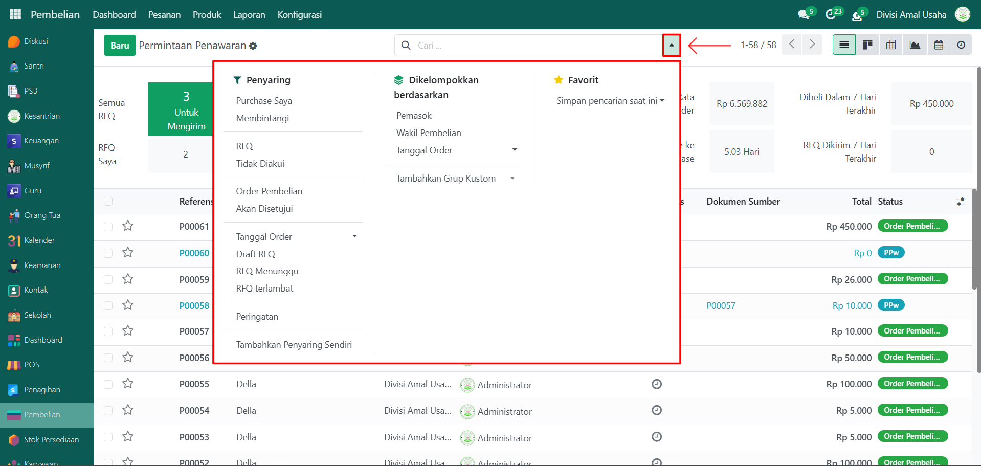 Klik toggle pencarian dan aktifkan fitur Filter untuk memudahkan pencarian data berdasarkan kriteria seperti Pembelian Saya, RFQ, Tanggal Order, dan lain-lain. Anda juga dapat melakukan pengelompokan berdasarkan Pemasok, Wakil Pembelian, atau Tanggal Order.