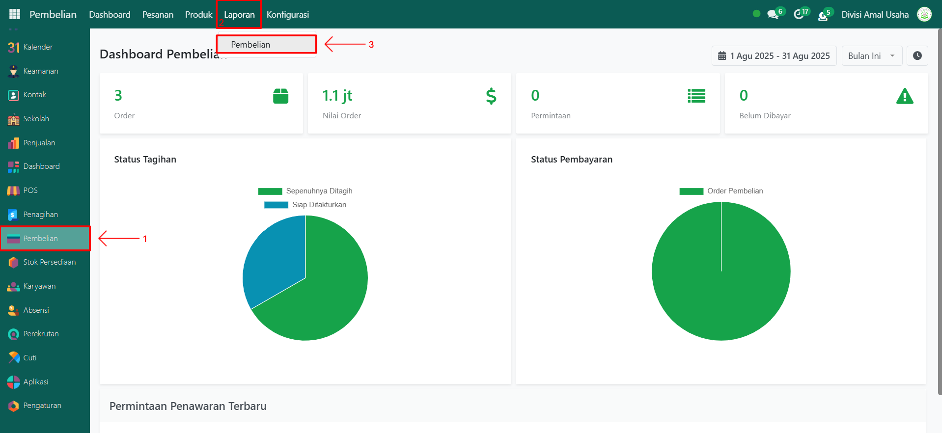 Buka modul Pembelian, lalu klik menu Laporan kemudian pilih submenu Pembelian.