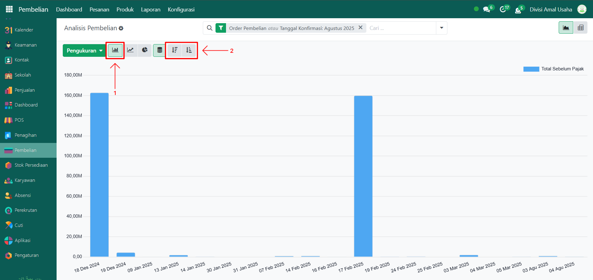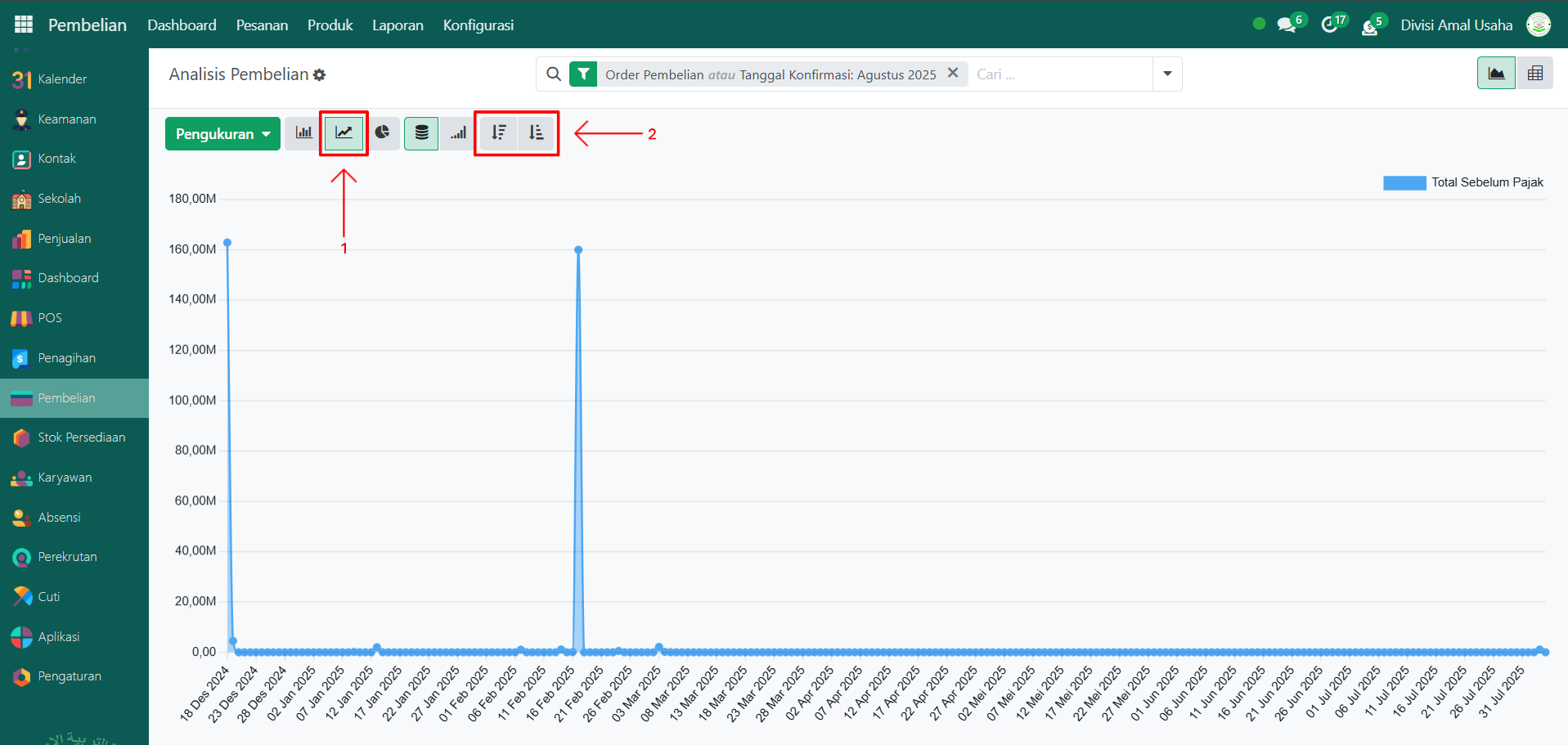 Secara default, halaman awal akan menampilkan grafik garis (line chart) berdasarkan Total Pembelian Sebelum Pajak. Anda dapat mengubah urutan data menjadi Ascending (kecil ke besar) atau Descending (besar ke kecil).