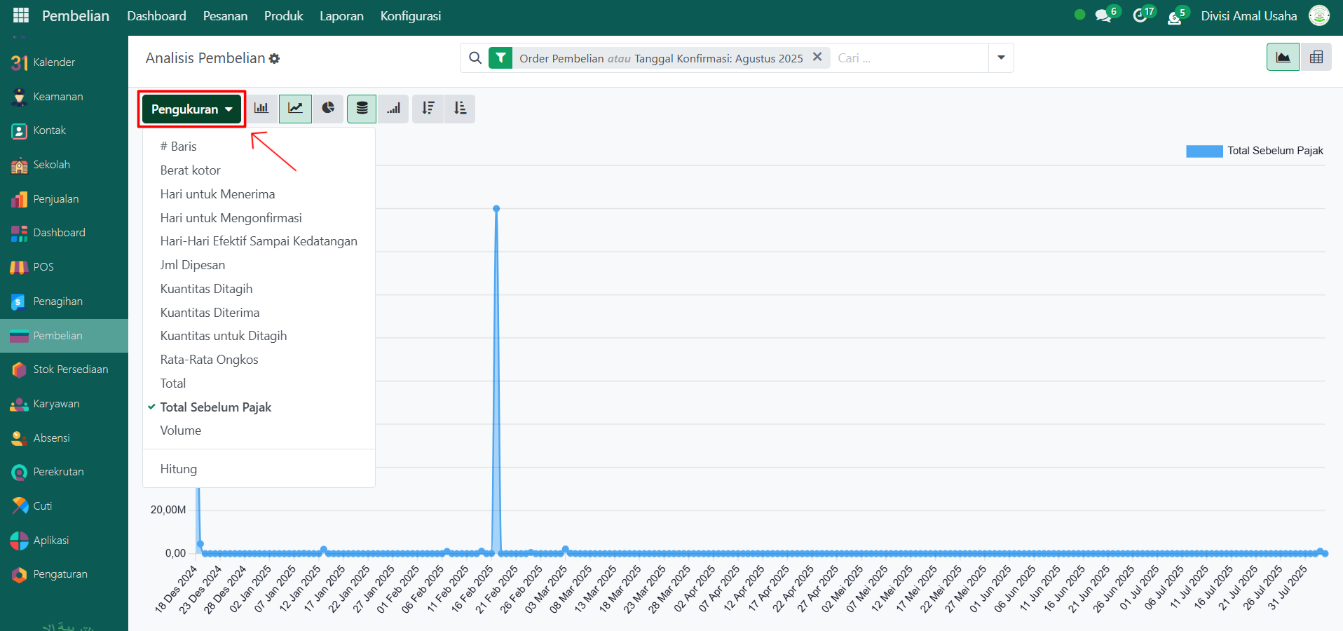 Klik tombol "Pengukuran" untuk menampilkan daftar pilihan nilai yang ingin ditampilkan pada grafik, seperti Berat Kotor, Total, Volume, Kuantitas, Jumlah Dipesan, dan lainnya. Pilih salah satu sesuai kebutuhan.