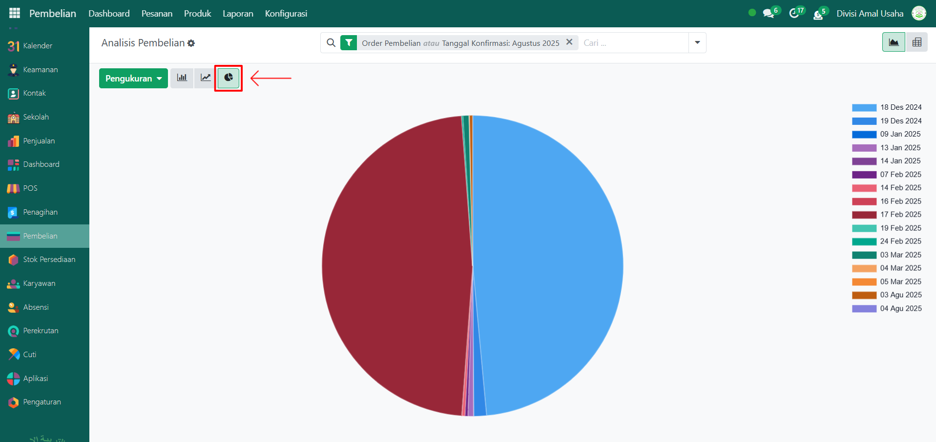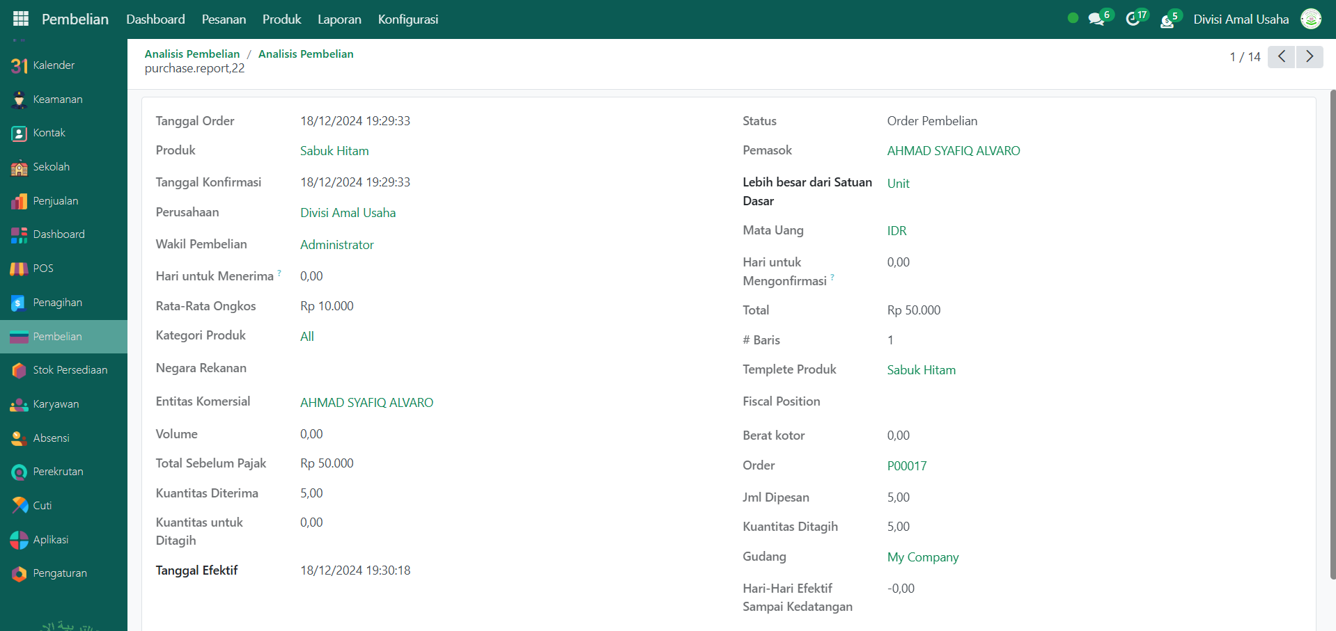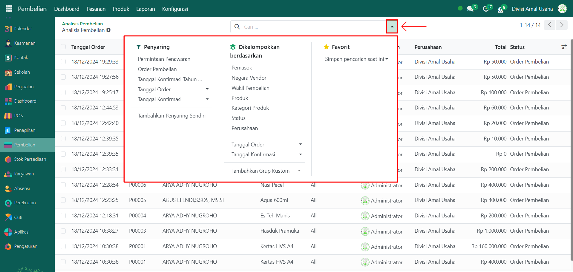 Berikut adalah langkah-langkah untuk melihat laporan pembelian pada Odoo Pesantren.