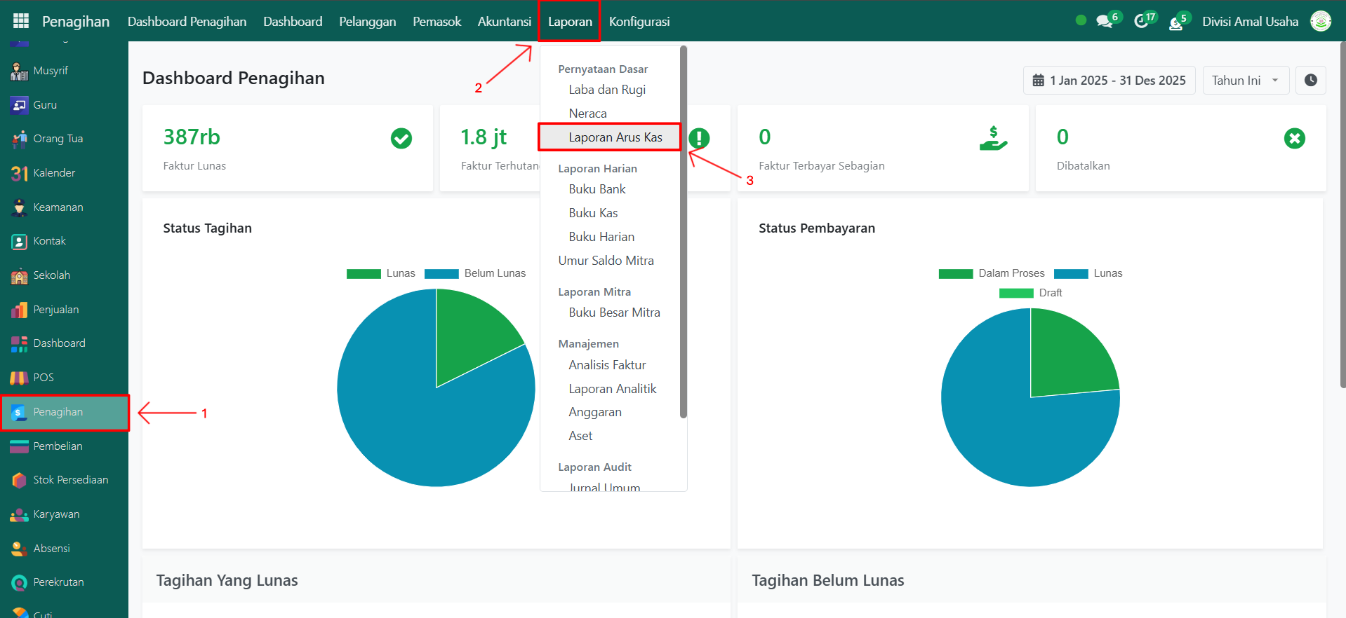 Buka modul Penagihan, lalu klik menu Laporan kemudian pilih submenu Arus Kas.