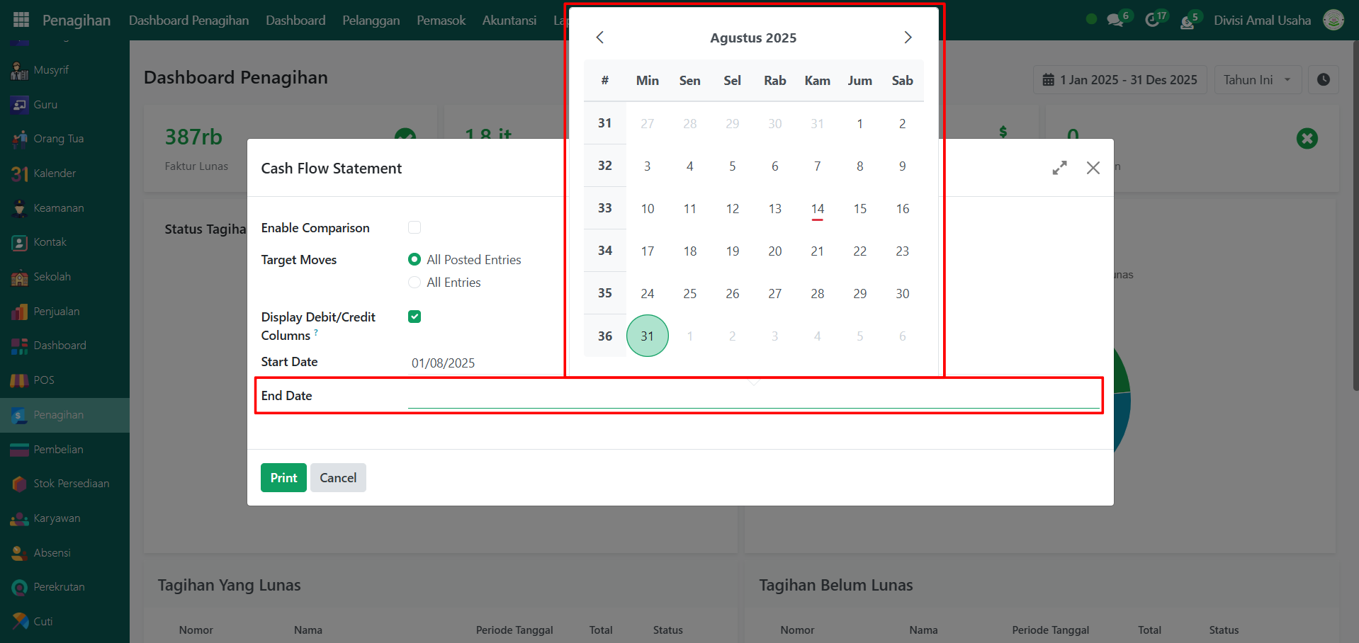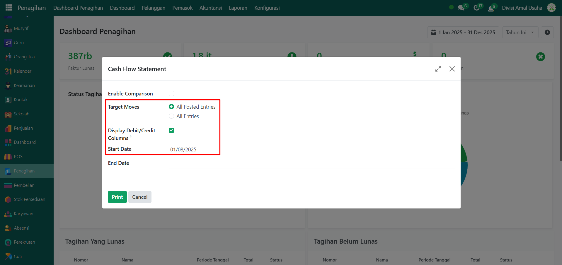 Berikut adalah langkah-langkah untuk mencetak laporan arus kas pada Odoo Pesantren.