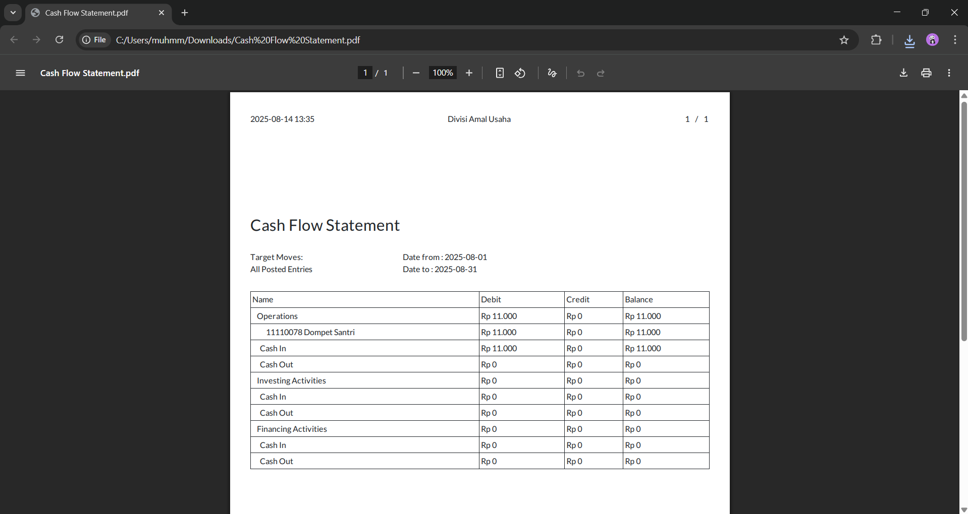 Buka file PDF tersebut untuk melihat rincian aliran masuk dan keluar kas pada periode yang dipilih.