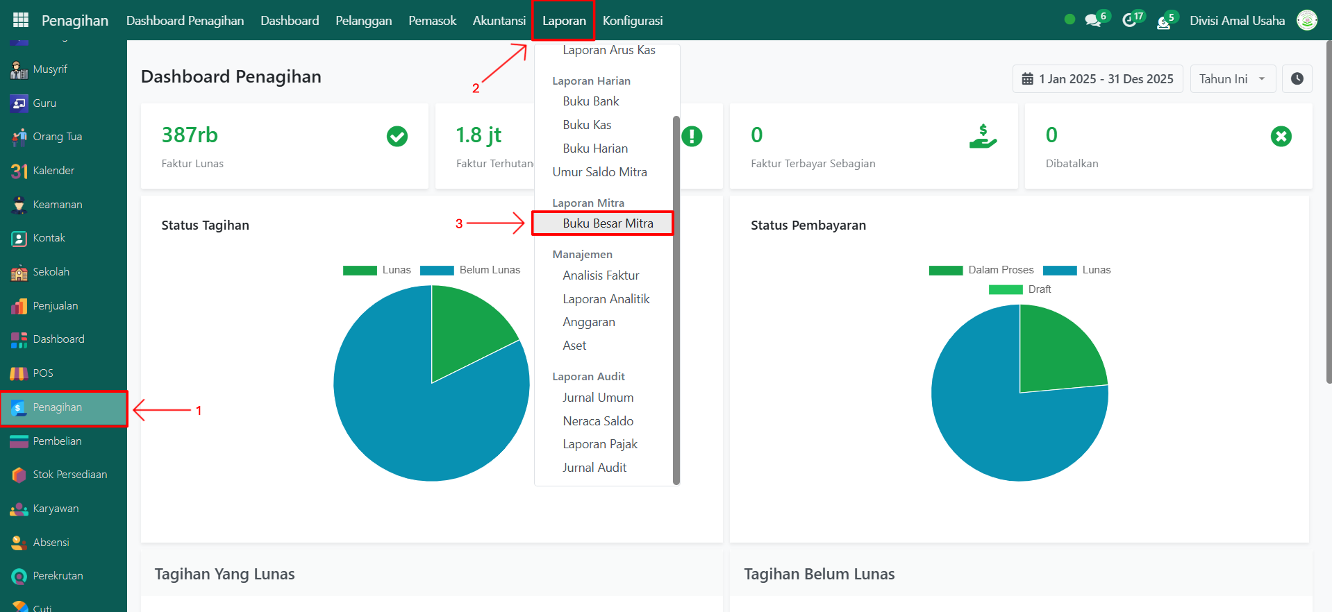 Buka modul Penagihan, lalu klik menu Laporan kemudian pilih submenu Buku Besar Mitra.