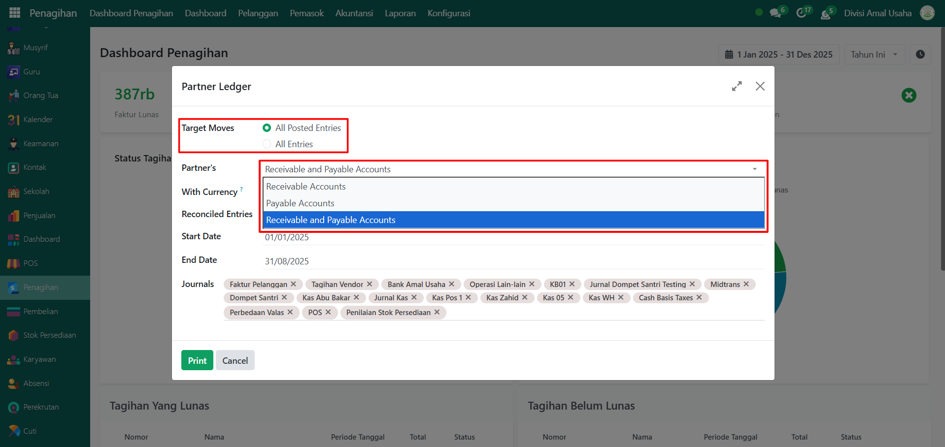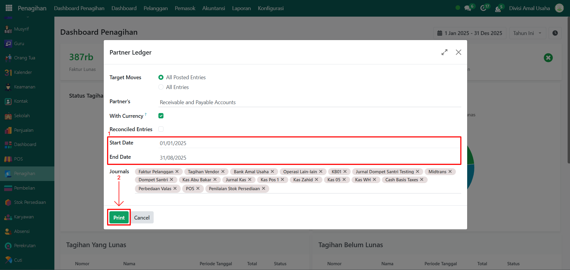 Tentukan periode laporan dengan memasukkan tanggal mulai dan masukkan tanggal akhir yang diinginkan. Setelah semua konfigurasi selesai, klik tombol "Print" untuk menghasilkan laporan Buku Besar Mitra.