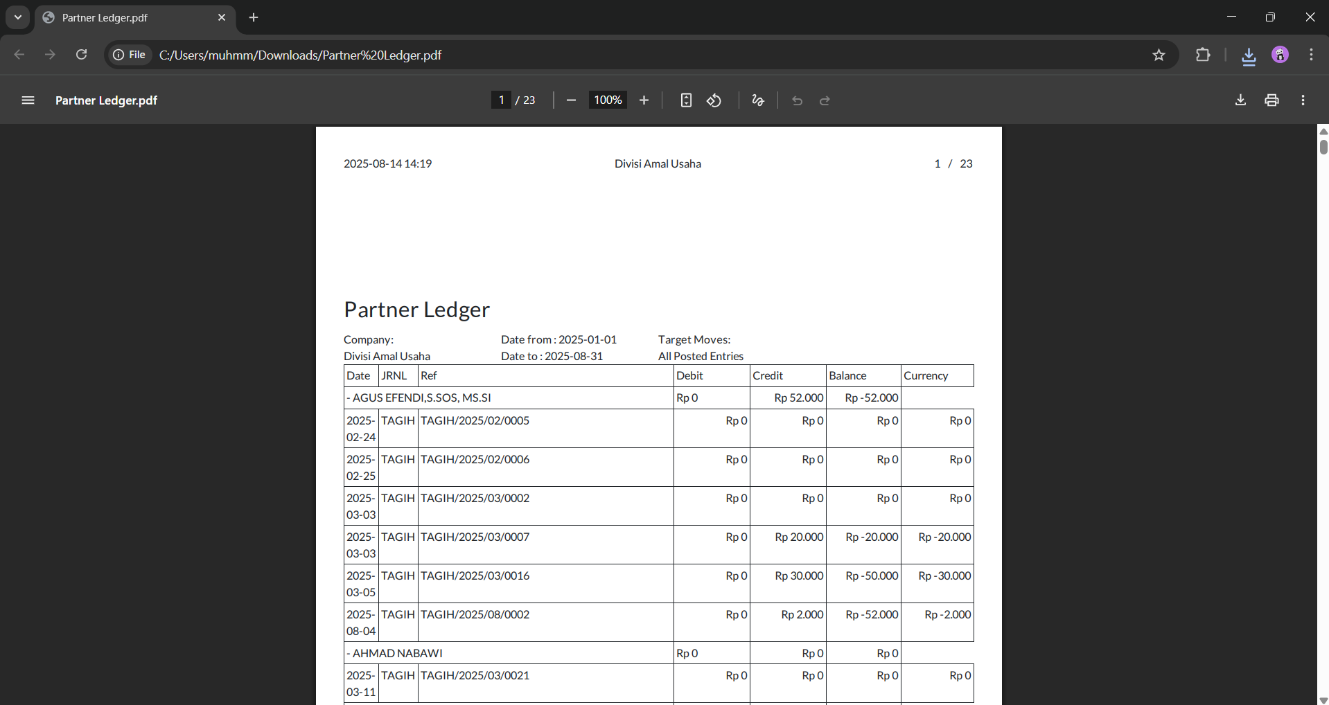 Buka file PDF tersebut untuk melihat detail transaksi mitra beserta saldo berjalan sesuai periode yang telah ditentukan.