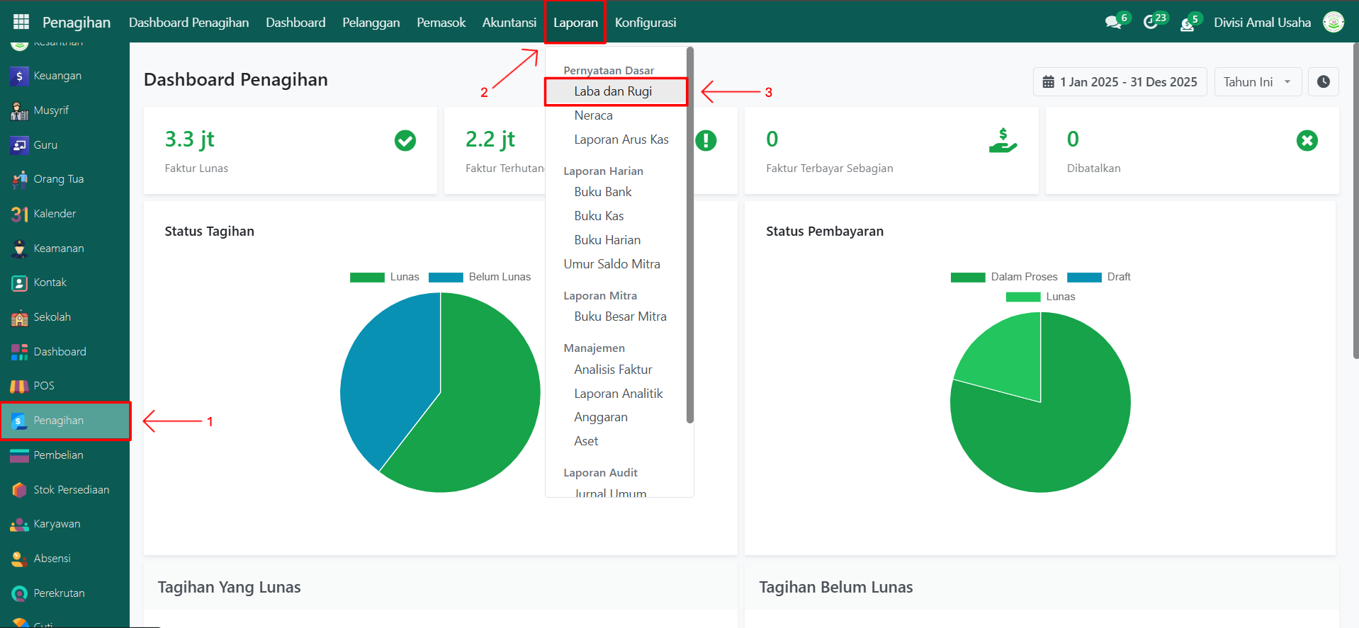 Buka modul Penagihan, lalu klik menu Laporan kemudian pilih submenu Laba dan Rugi.