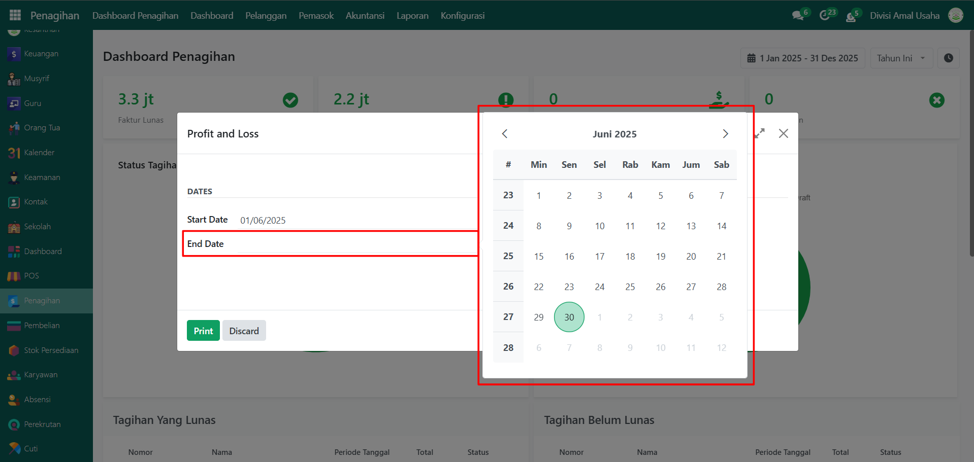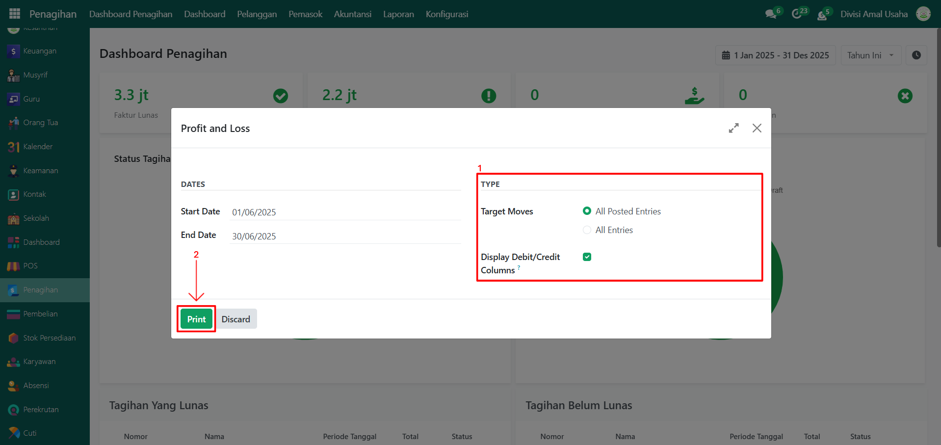 Berikut adalah langkah-langkah untuk mencetak laporan laba & rugi pada Odoo Pesantren.
