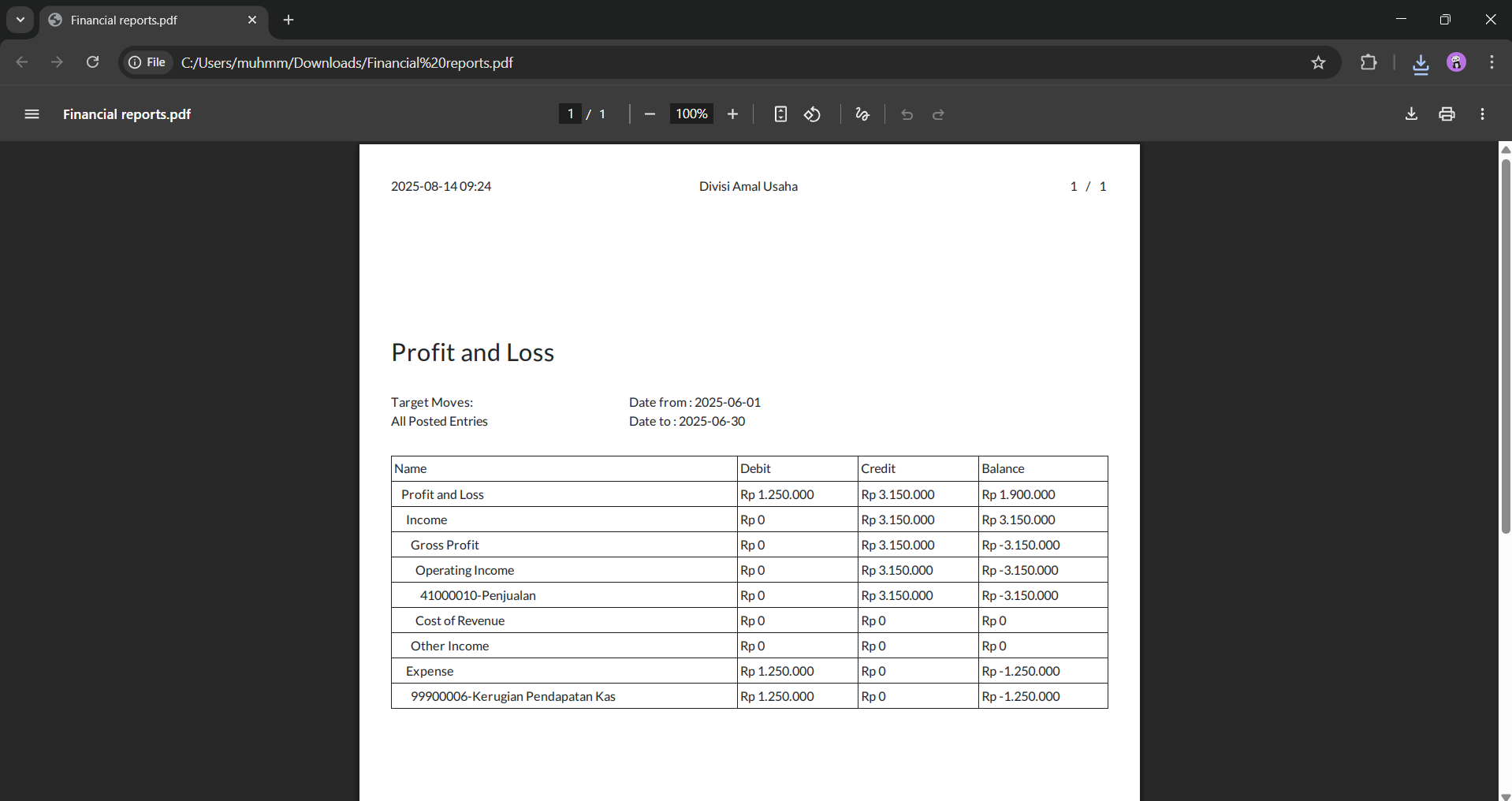 Buka file PDF tersebut untuk melihat detail informasi pendapatan, beban, dan hasil perhitungan laba atau rugi pada periode yang dipilih.