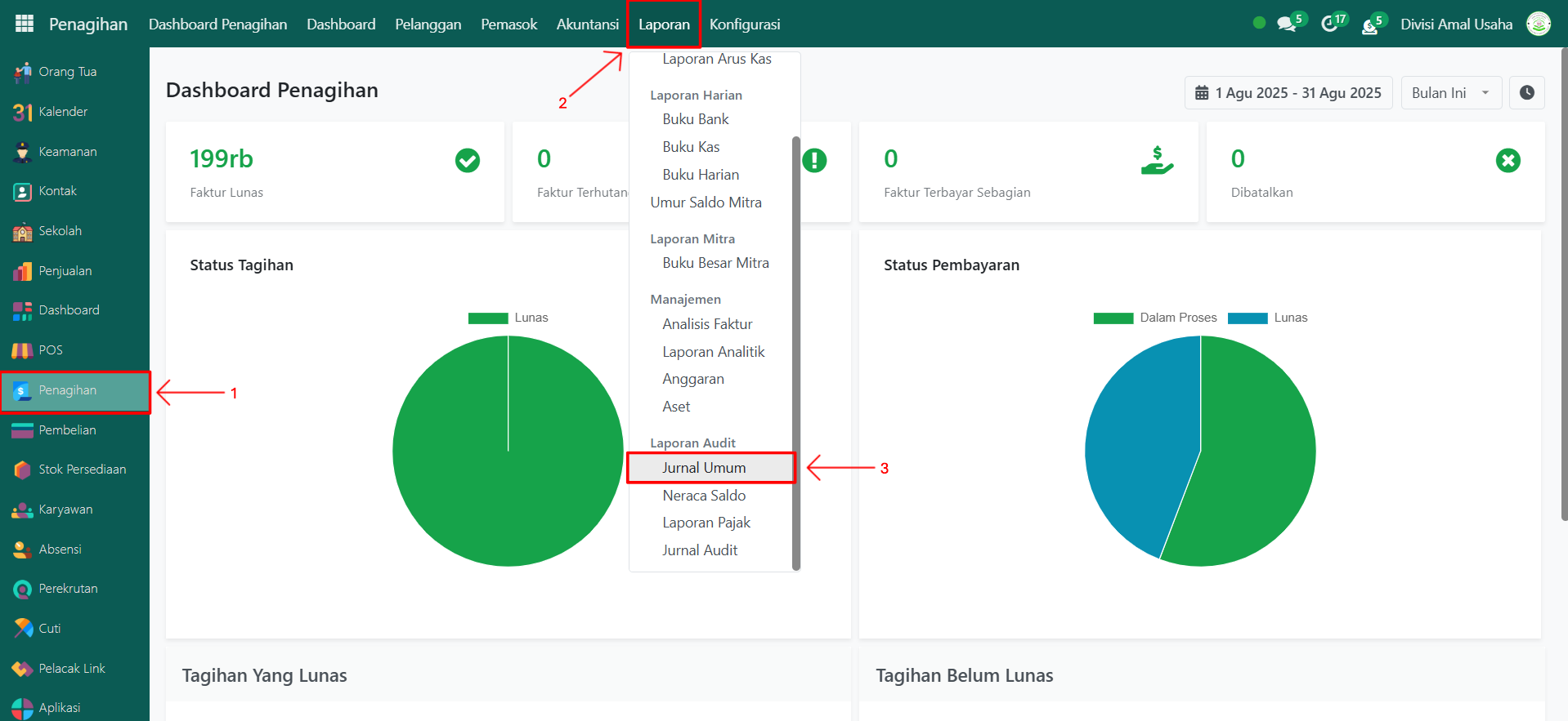 Buka modul Penagihan, lalu klik menu Laporan kemudian pilih submenu Jurnal Umum.
