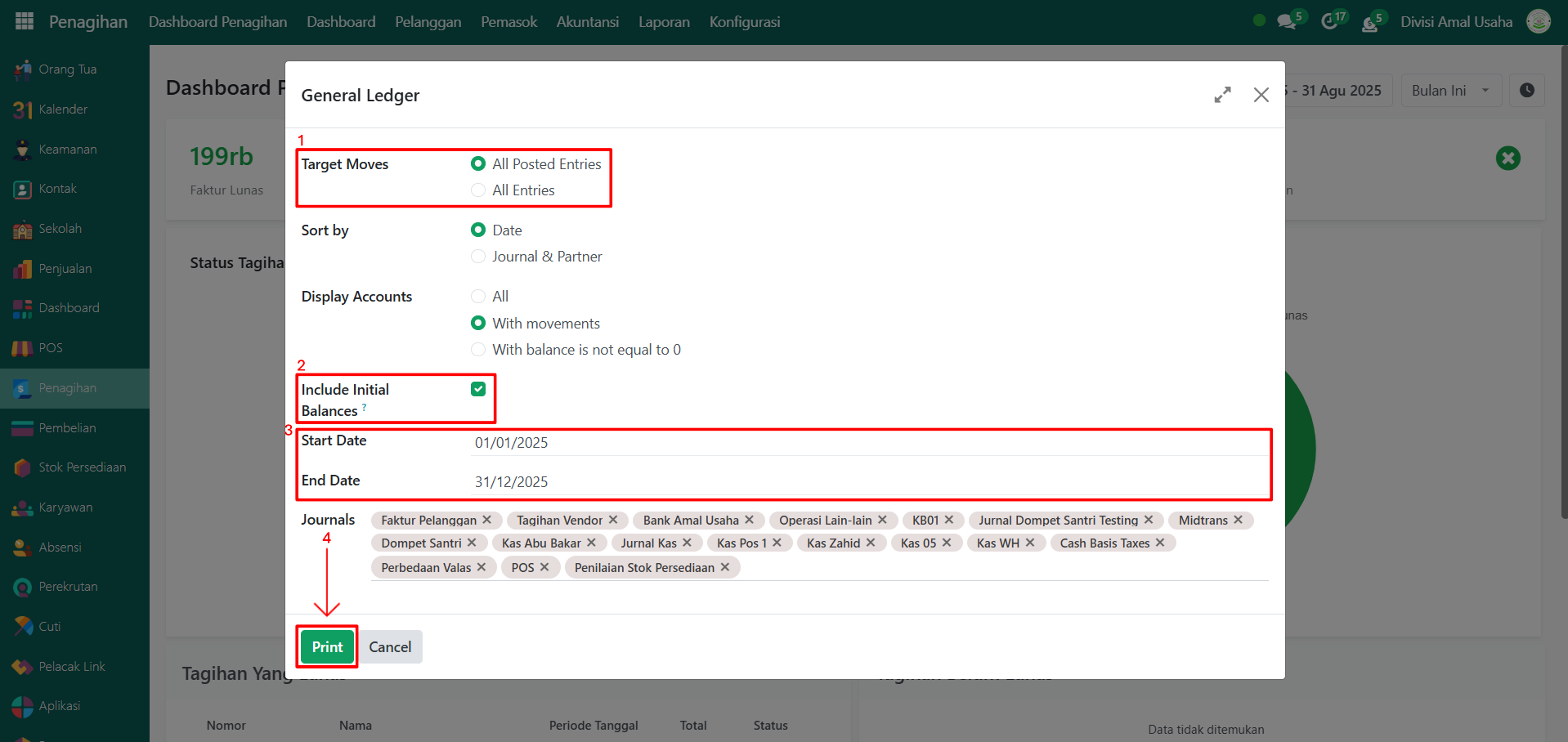 Setelah selesai melakukan konfigurasi, klik tombol "Print" untuk memproses dan mencetak laporan jurnal umum.