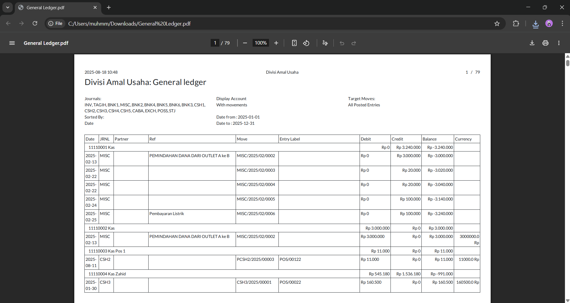 Buka file PDF laporan jurnal umum untuk melihat daftar transaksi jurnal secara lengkap, termasuk kolom debit, kredit, dan saldo berjalan.