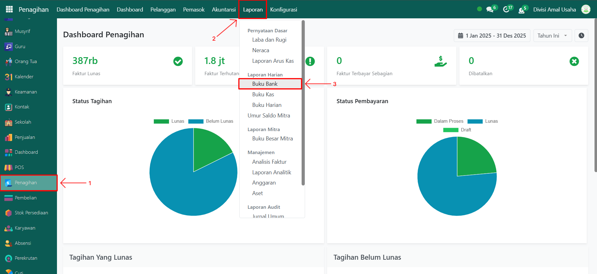 Buka modul Penagihan, lalu klik menu Laporan kemudian pilih submenu Buku Bank.