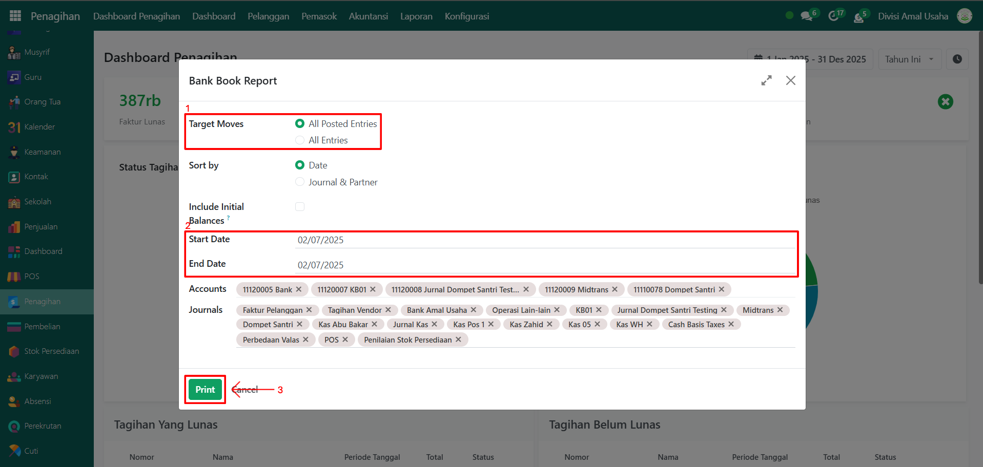 Berikut adalah langkah-langkah untuk mencetak laporan buku bank pada Odoo Pesantren.