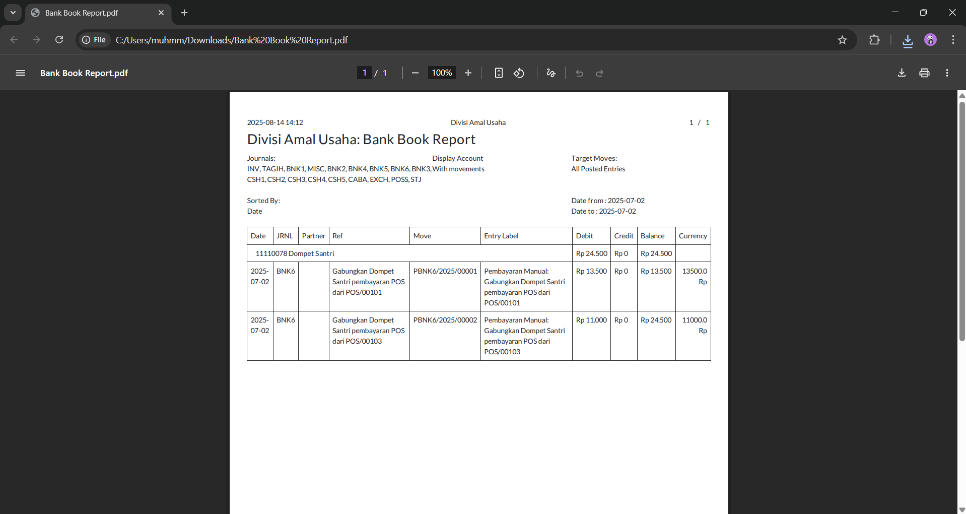 Sistem akan menghasilkan laporan Buku Bank dalam format PDF.