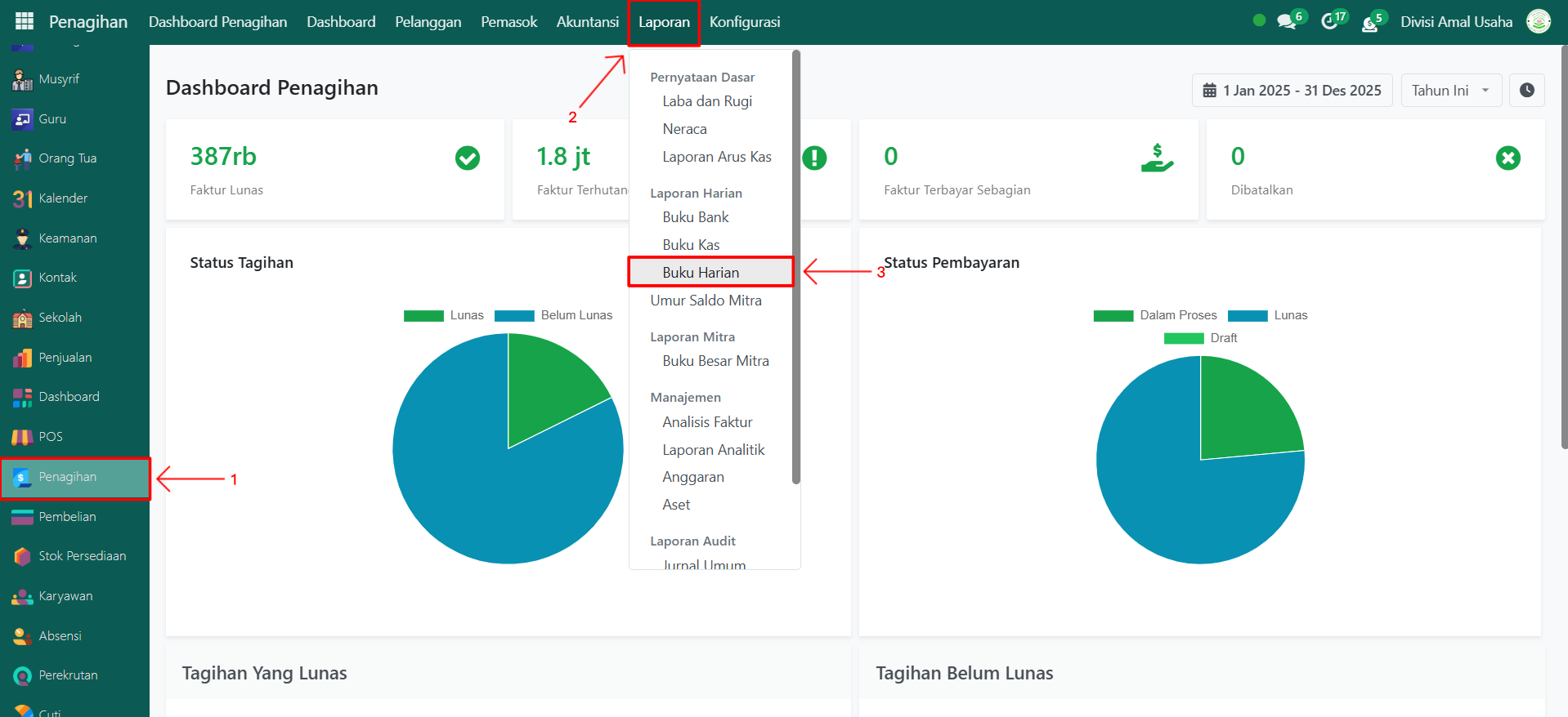 Buka modul Penagihan, lalu klik menu Laporan kemudian pilih submenu Buku Harian.