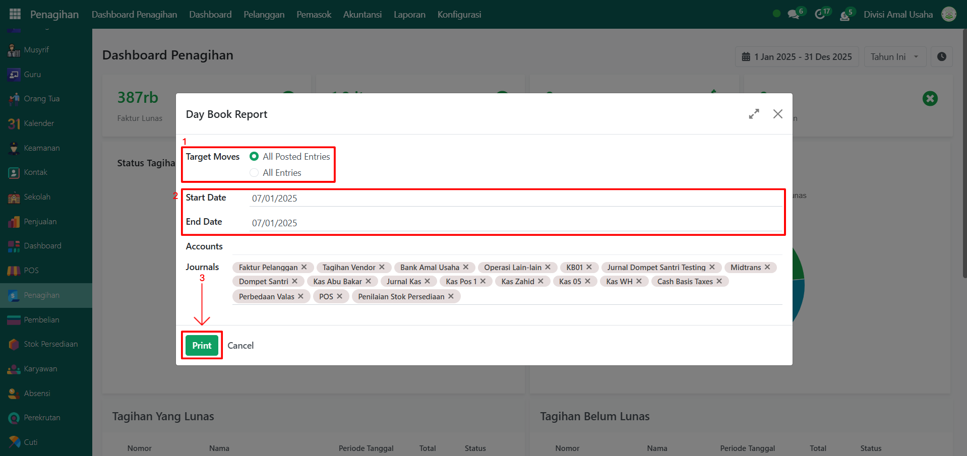 Setelah konfigurasi selesai, klik tombol "Print" untuk mulai mencetak laporan Buku Harian.