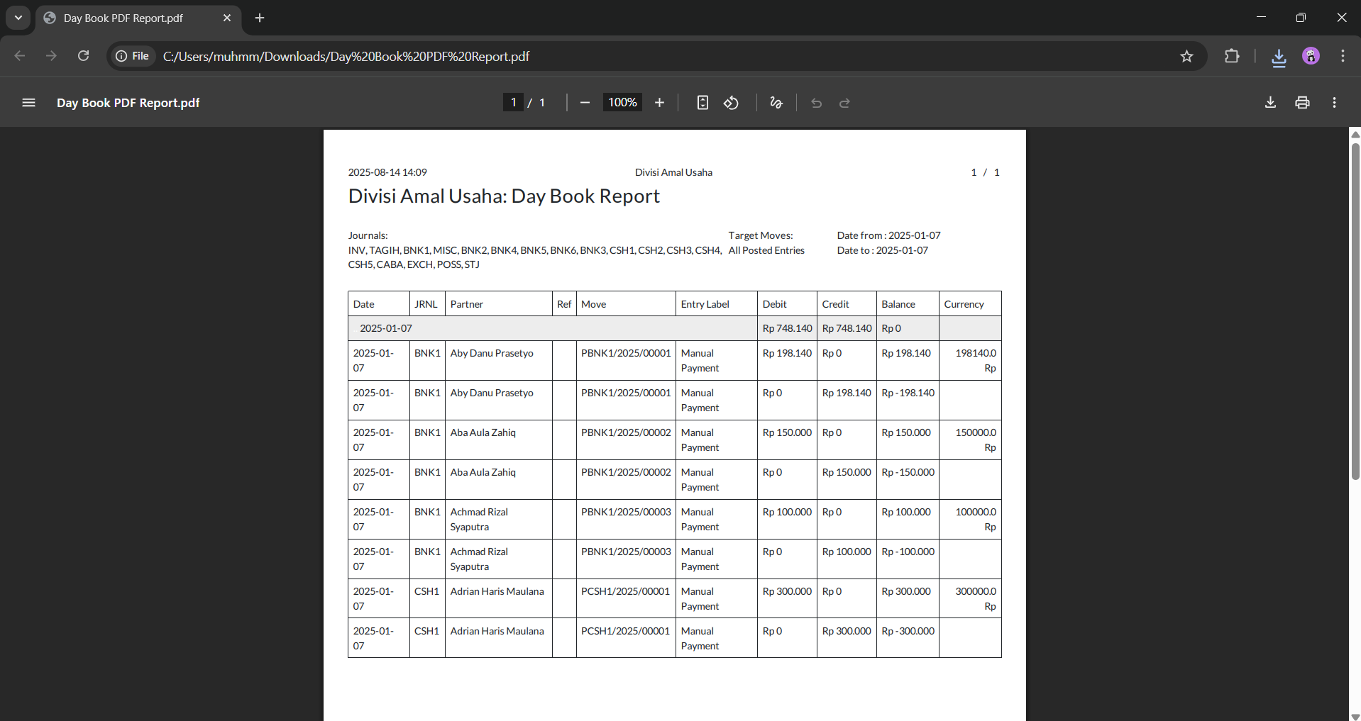 Buka file PDF tersebut untuk melihat daftar transaksi harian yang berisi detail jurnal seperti tanggal, referensi, akun, deskripsi, serta nilai debit dan kredit.