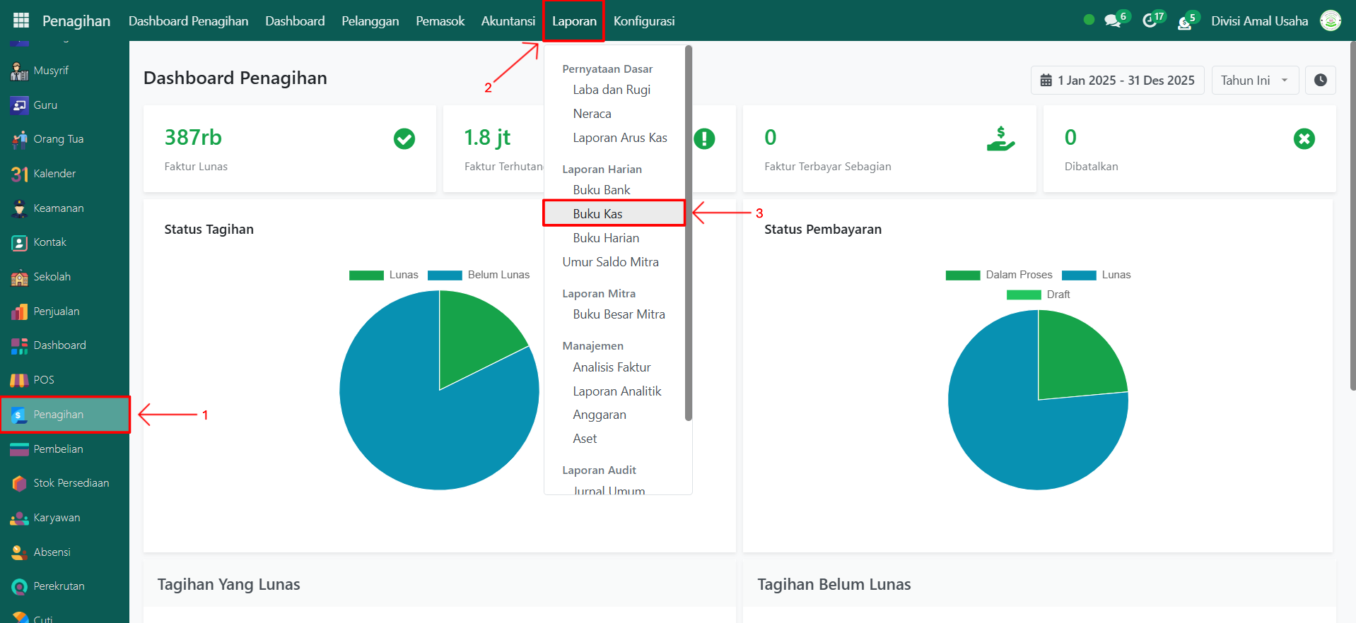 Buka modul Penagihan, lalu klik menu Laporan kemudian pilih submenu Buku Kas.