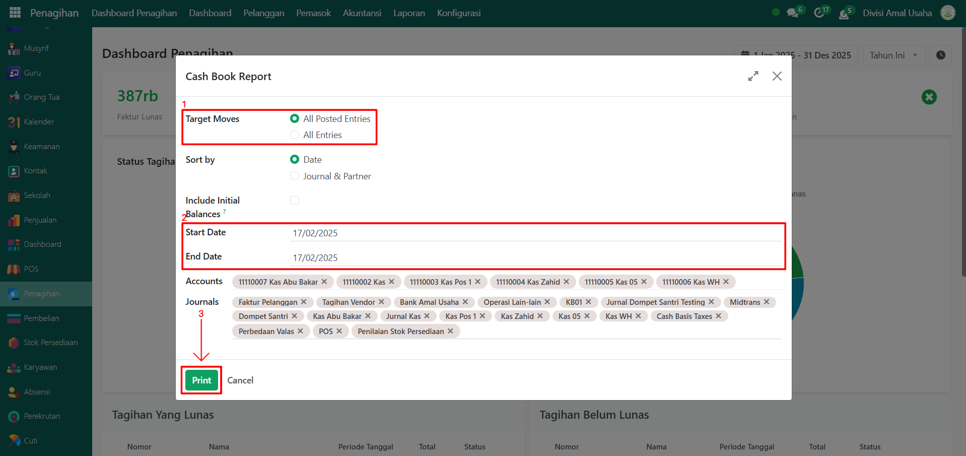 Berikut adalah langkah-langkah untuk mencetak laporan buku kas pada Odoo Pesantren.