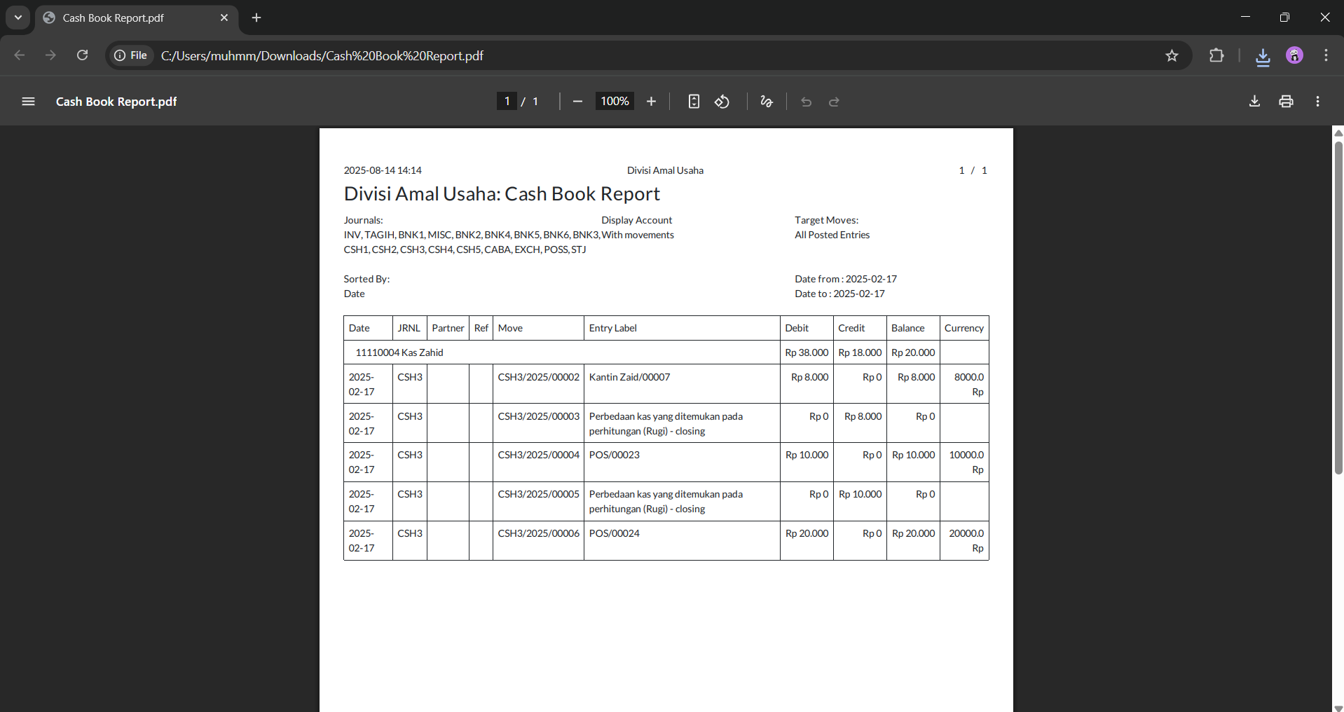 Buka file PDF tersebut untuk melihat detail transaksi penerimaan, pengeluaran, serta saldo kas sesuai periode yang dipilih.