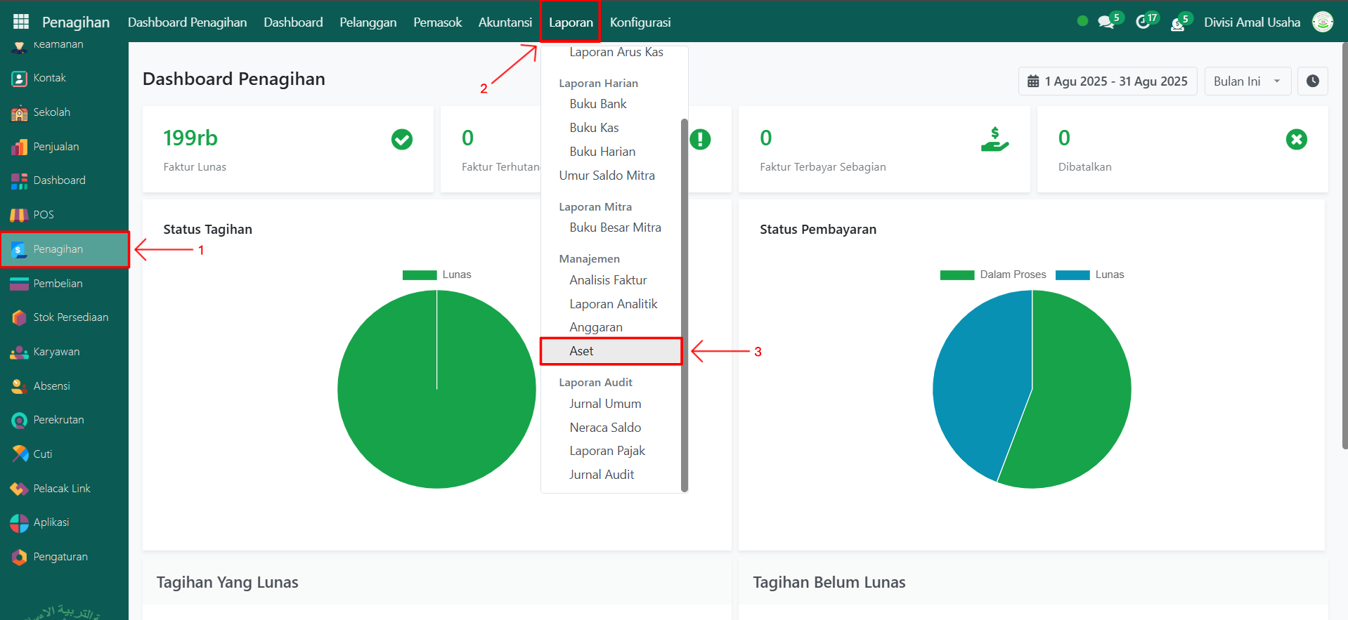 Buka modul Penagihan, lalu klik menu Laporan kemudian pilih submenu Aset.