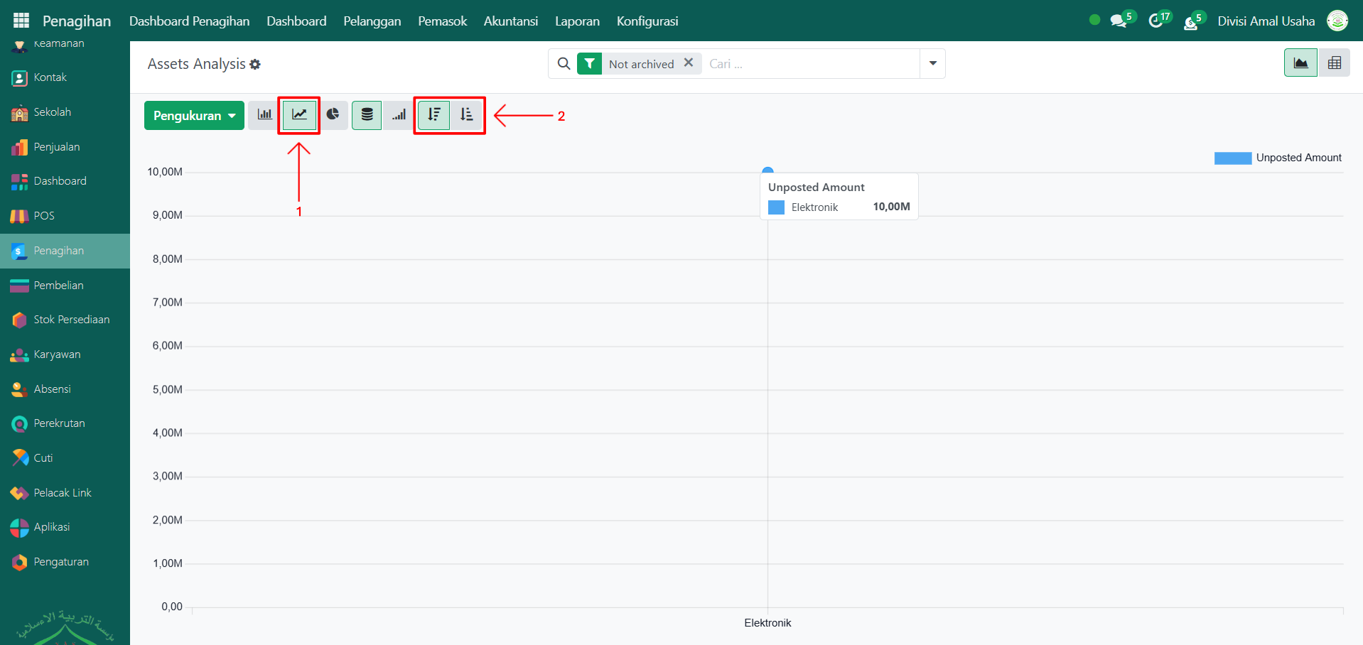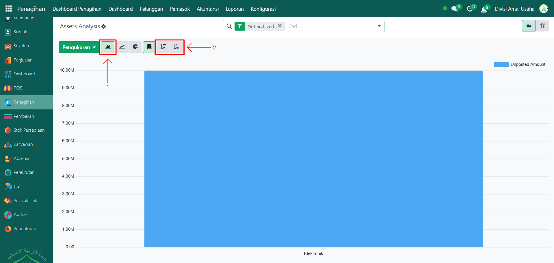 Secara default, halaman Laporan Aset akan menampilkan grafik batang berdasarkan unposted amount. Anda dapat mengurutkan grafik batang dari kecil ke besar (Ascending) atau besar ke kecil (Descending).