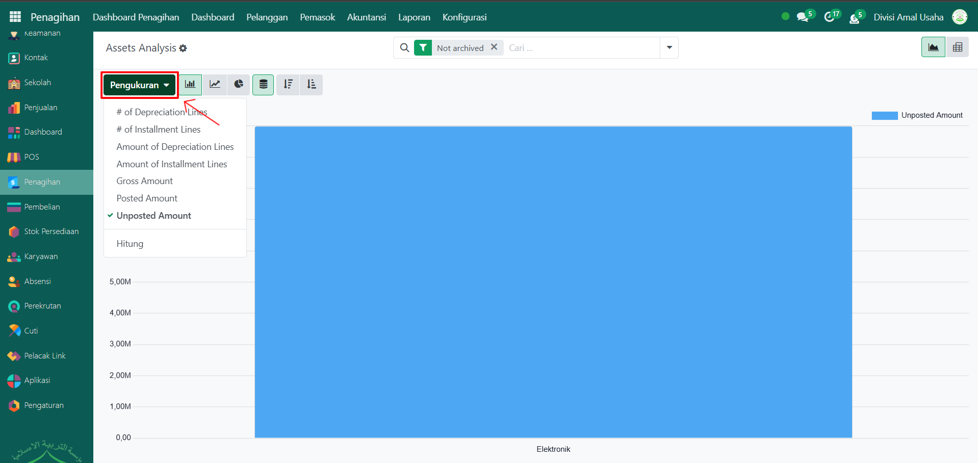 Klik tombol "Pengukuran" untuk menampilkan daftar opsi pengukuran yang tersedia, seperti Gross Amount, Posted Amount, Unposted Amount, dan lainnya. Pilih salah satu sesuai kebutuhan analisis Anda.
