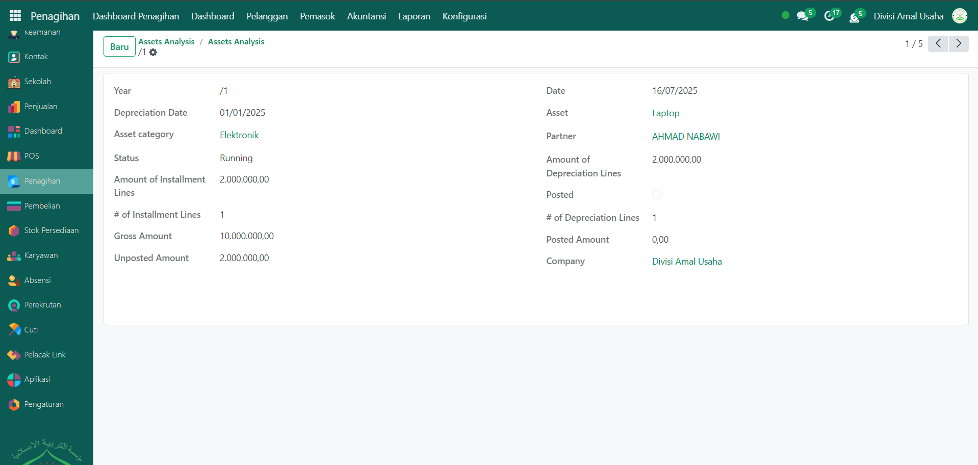 Laporan Aset pada Odoo Pesantren digunakan untuk memantau daftar aset tetap yang dimiliki oleh lembaga. Laporan ini menyajikan informasi terkait nilai perolehan, status aset, penyusutan, serta detail kategori aset yang memudahkan pengawasan dan analisis keuangan.