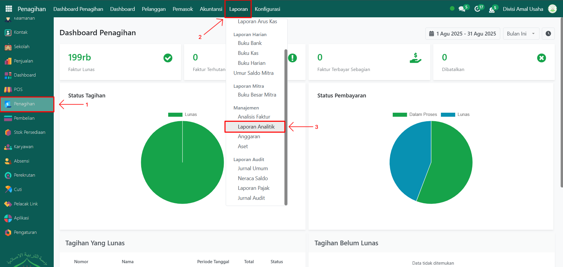 Buka modul Penagihan, lalu klik menu Laporan kemudian pilih submenu Laporan Analitik.