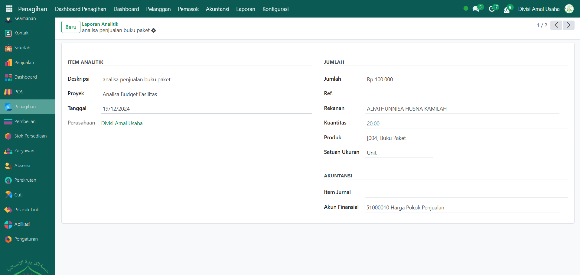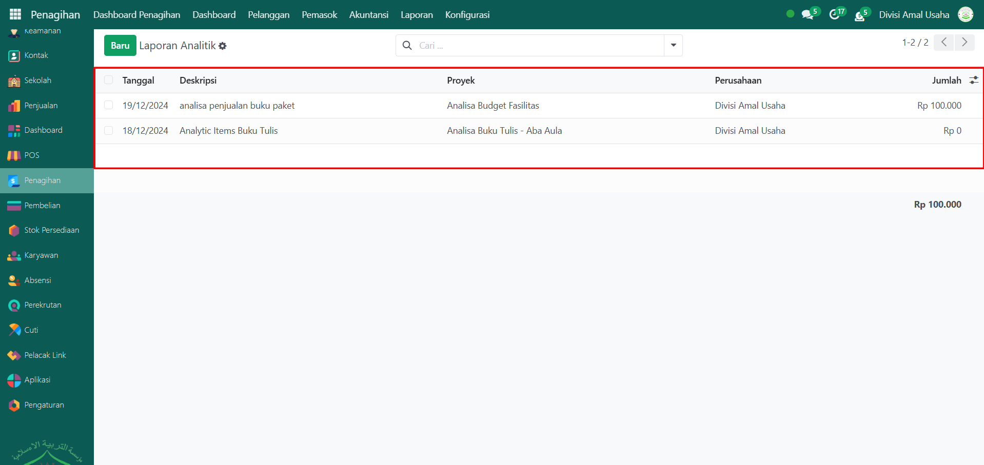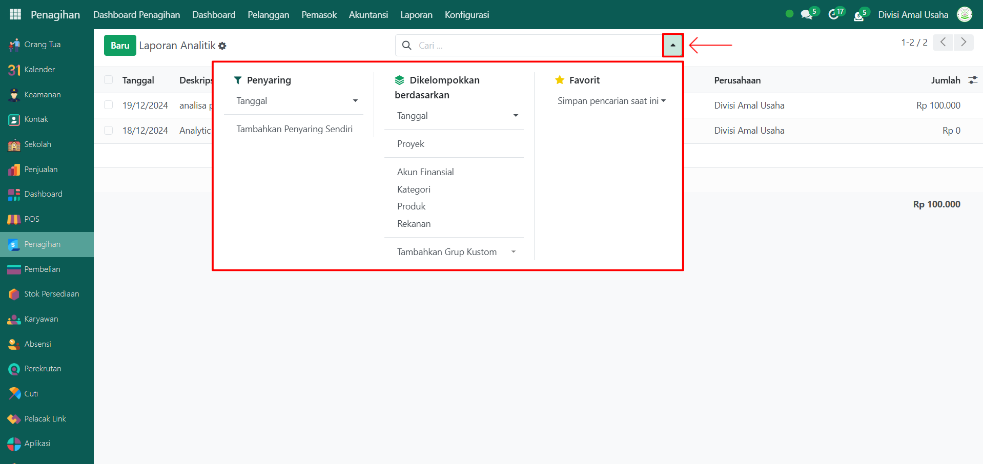 Berikut adalah langkah-langkah untuk melihat laporan analitik pada Odoo Pesantren.
