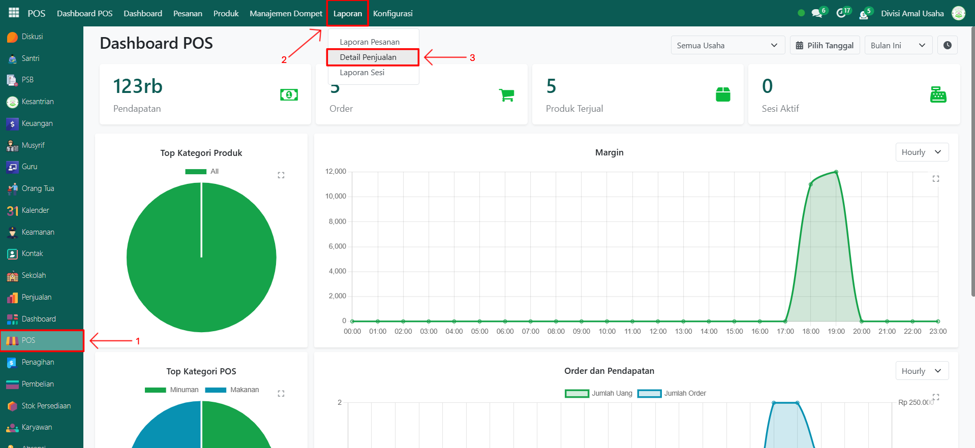 Buka modul POS, lalu klik menu Laporan kemudian pilih submenu Detail Penjualan.