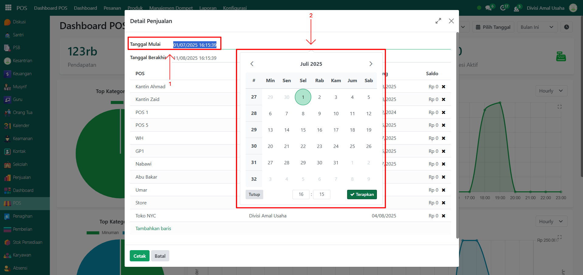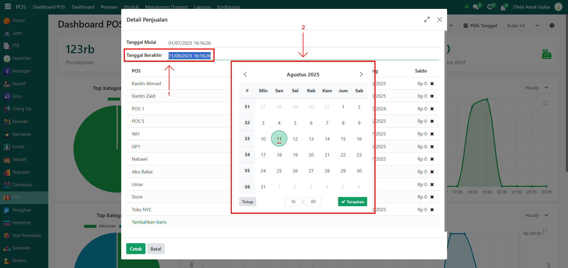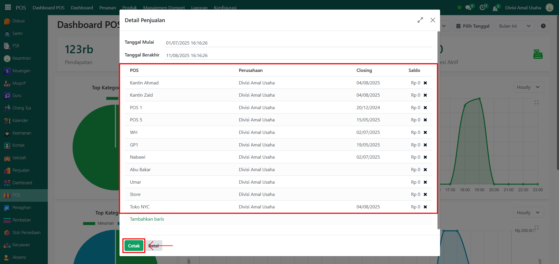 Pastikan pilihan POS sudah mencakup seluruh POS yang ingin dimasukkan dalam laporan. Anda juga dapat memilih POS tertentu jika hanya ingin menampilkan data dari POS tersebut. Jika sudah, klik tombol "Cetak" untuk memproses dan menghasilkan laporan detail penjualan.