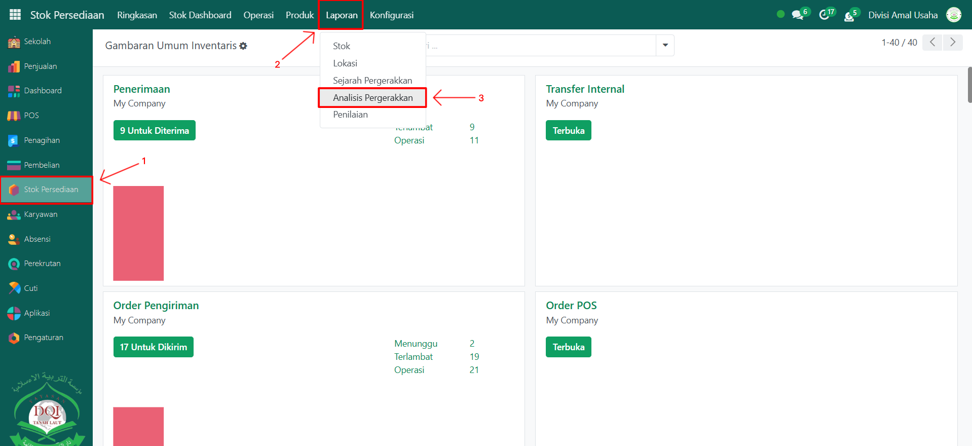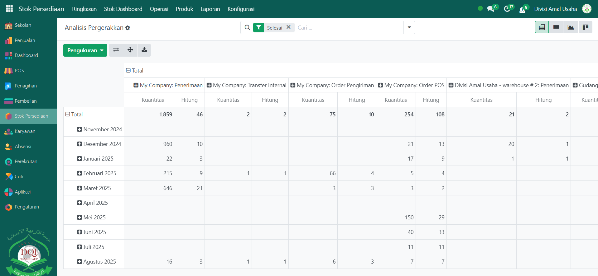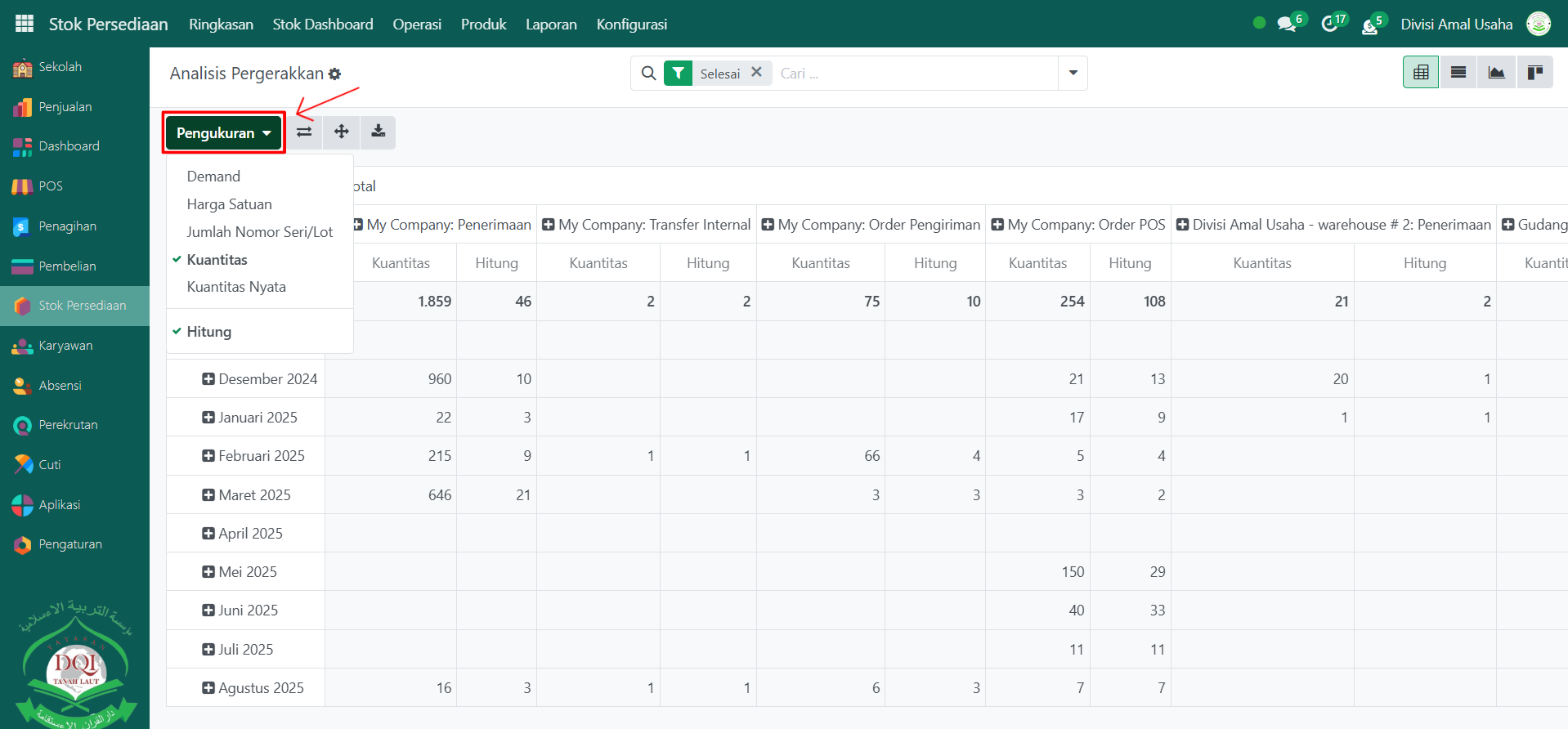 Berikut adalah langkah-langkah untuk melihat analisis pergerakan barang pada Odoo Pesantren.