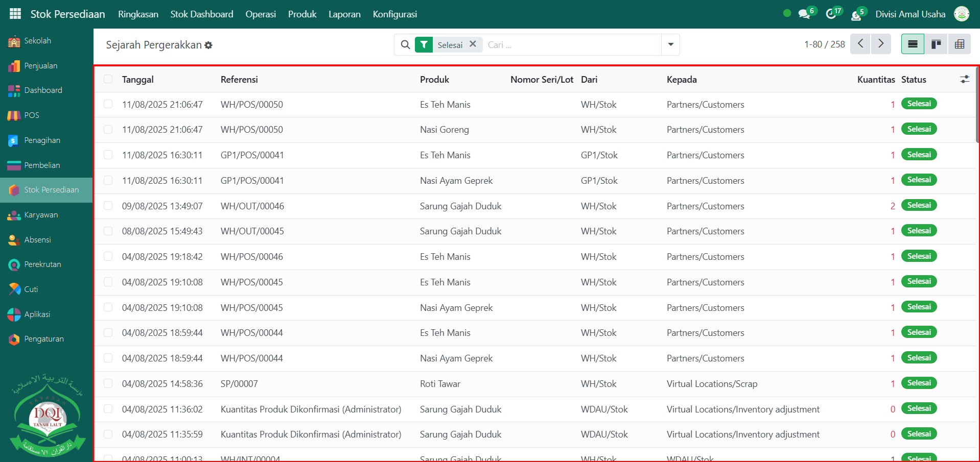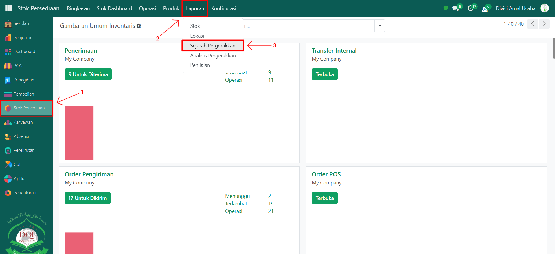 Berikut adalah langkah-langkah untuk melihat sejarah pergerakan stok barang pada Odoo Pesantren.