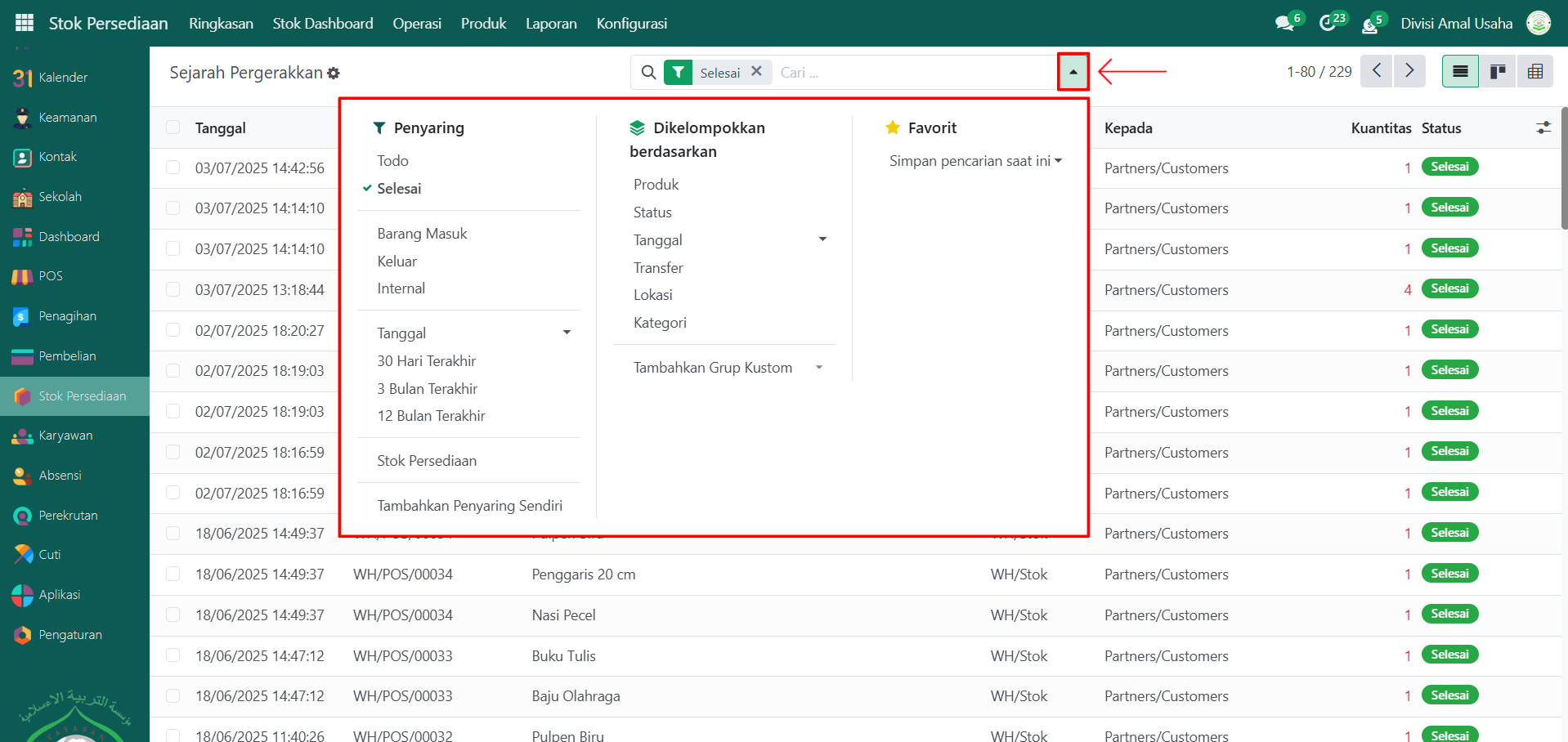 Gunakan toggle pencarian untuk memfilter data berdasarkan kategori seperti Barang Masuk, Barang Keluar, atau Operasi Internal, dan lainnya serta filter Kelompok seperti Produk, Status Pergerakan, Tanggal Transaksi, dan lainnya.