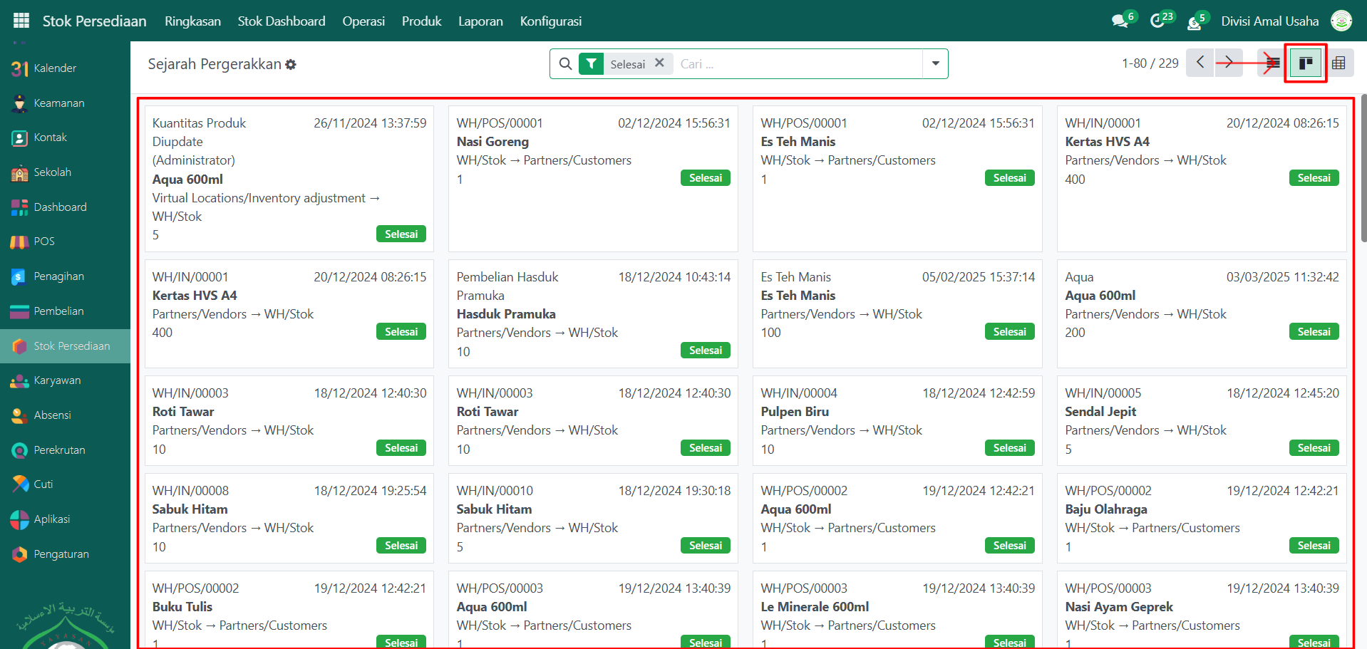 Untuk mengubah tampilan, klik icon Kanban di sebelah icon daftar agar data pergerakan stok ditampilkan dalam bentuk kartu visual.