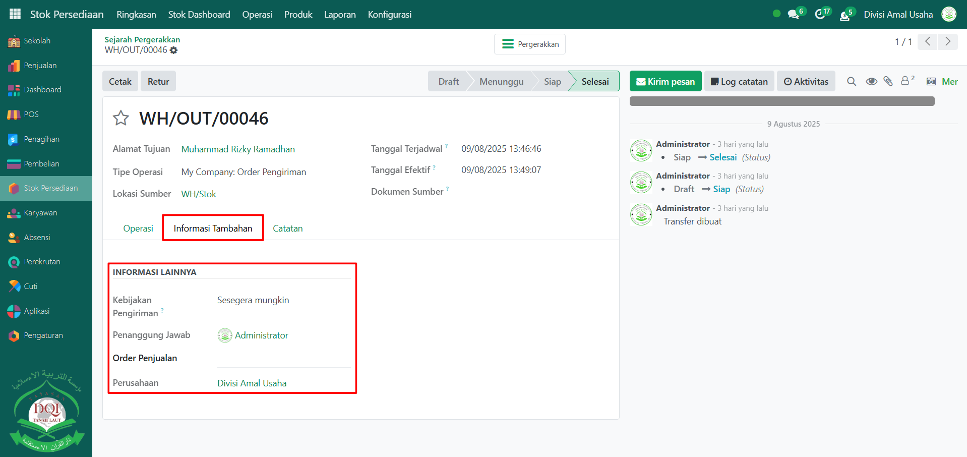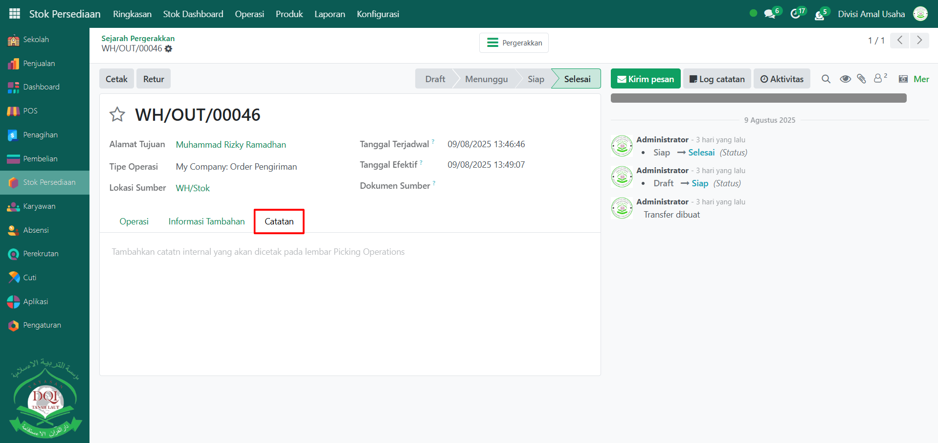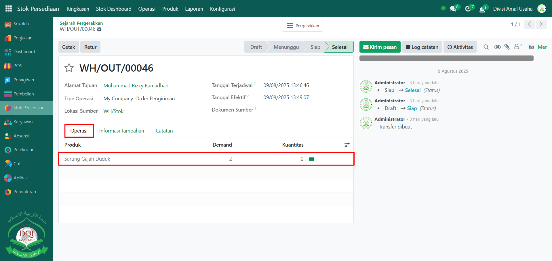 Halaman detail akan menampilkan informasi lengkap mengenai transaksi, termasuk tanggal penerimaan dari pemasok atau tanggal pengiriman ke pelanggan. Pada Tab Operasi Anda dapat melihat daftar produk yang terlibat beserta kuantitas yang diterima, dikirim, atau dipindahkan.