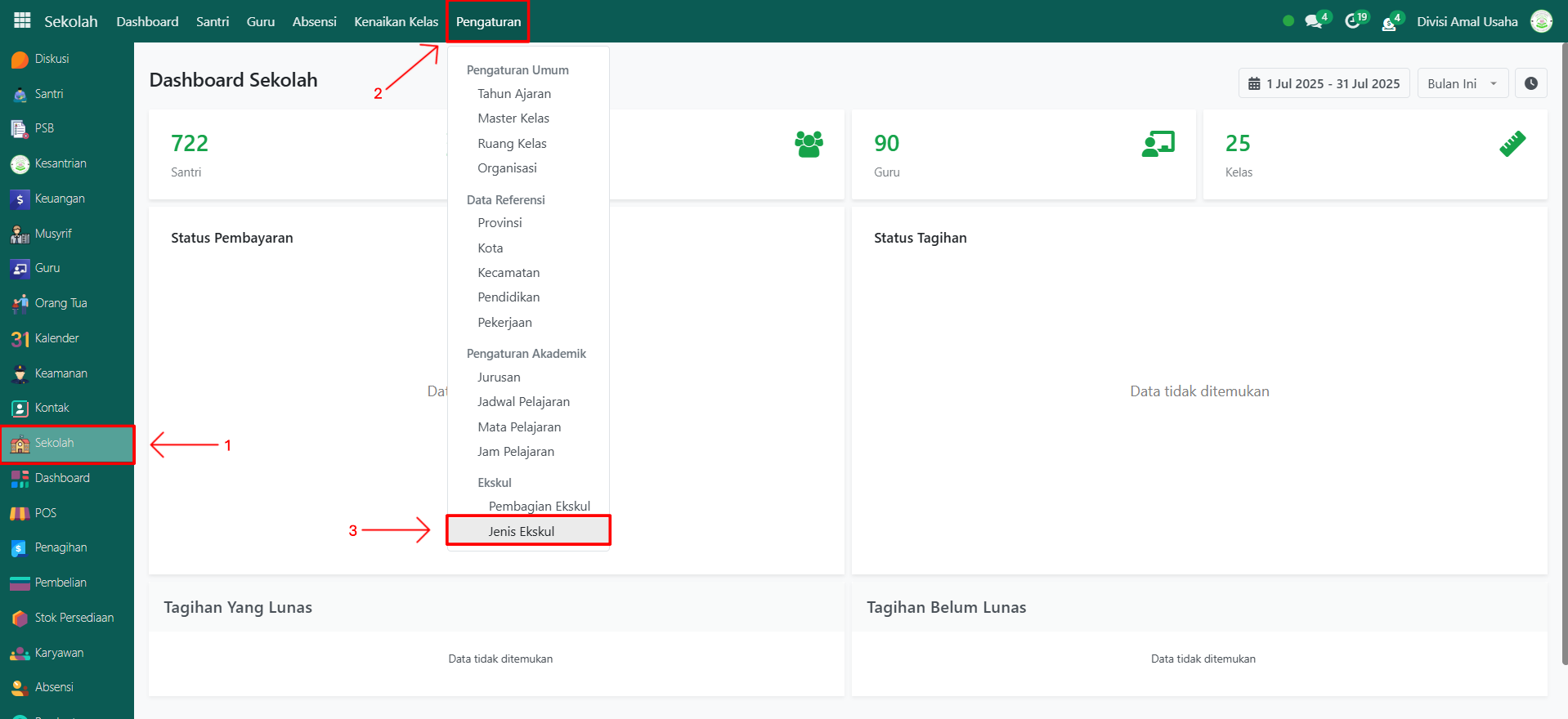 Data Jenis Ekskul digunakan untuk mendefinisikan jenis-jenis kegiatan ekstrakurikuler yang tersedia di pesantren, baik yang bersifat wajib maupun pilihan. Data ini akan menjadi acuan utama dalam pengelolaan aktivitas ekstrakurikuler santri sesuai tingkat kelas masing-masing.